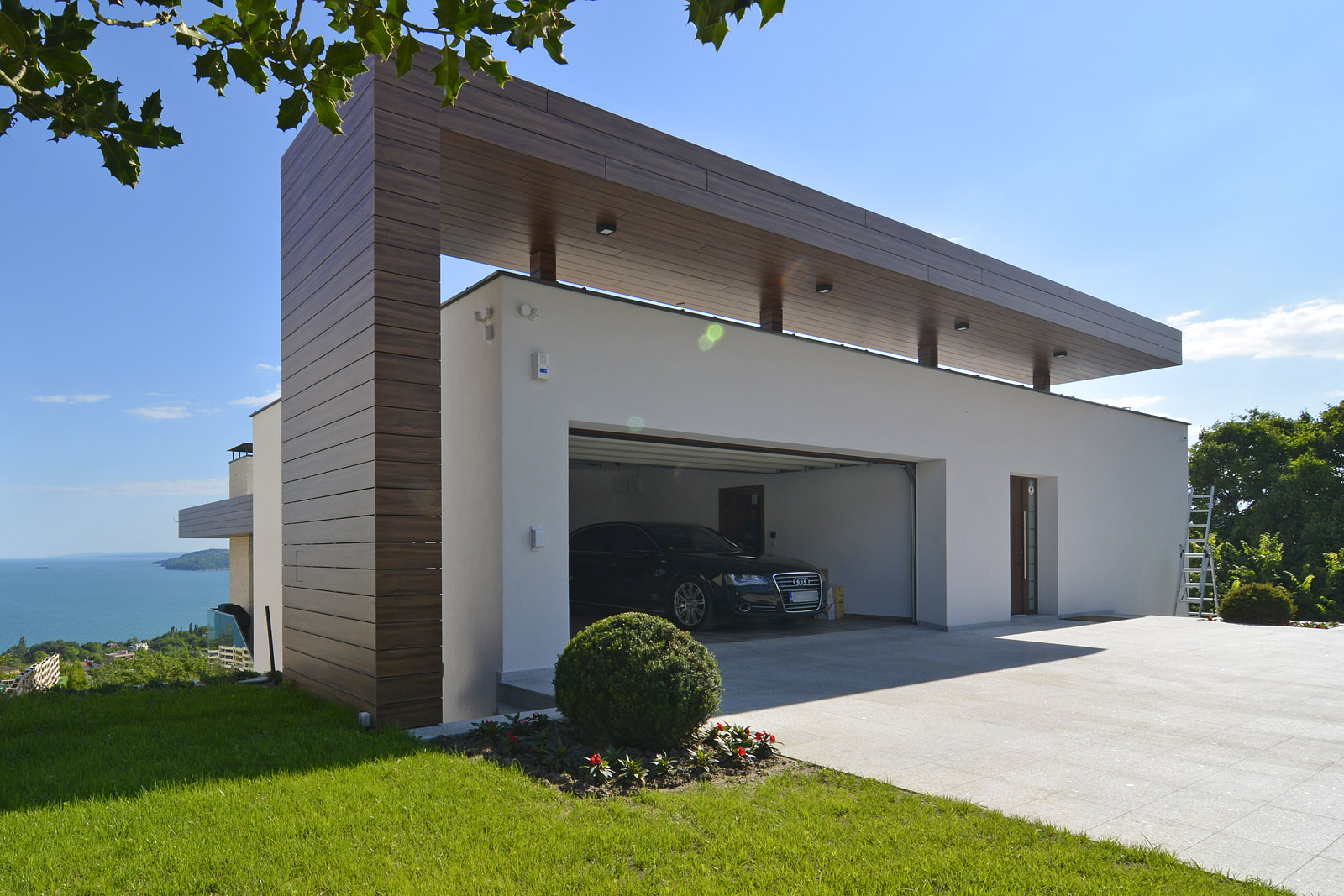 Последното – пето ниво осигурява подхода към сградата от уличната регулация. Тук са разположени входно антре с горно осветление, портманто и тоалетна за гости. Разбира се, архитектите са помислили и за парко място – на разположение на това ниво за бъдещите обитатели на тази романтична къща е и гараж за два автомобила.