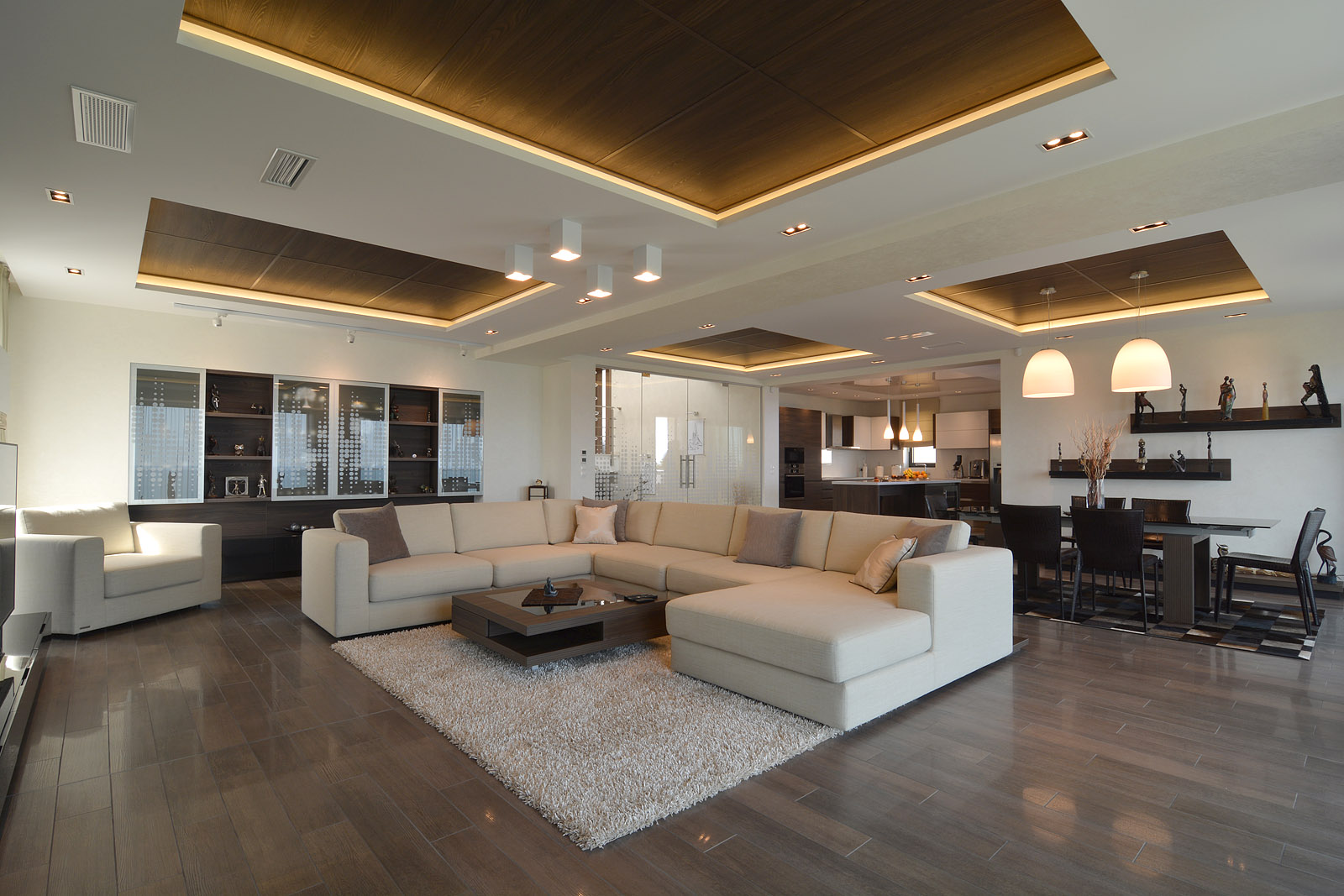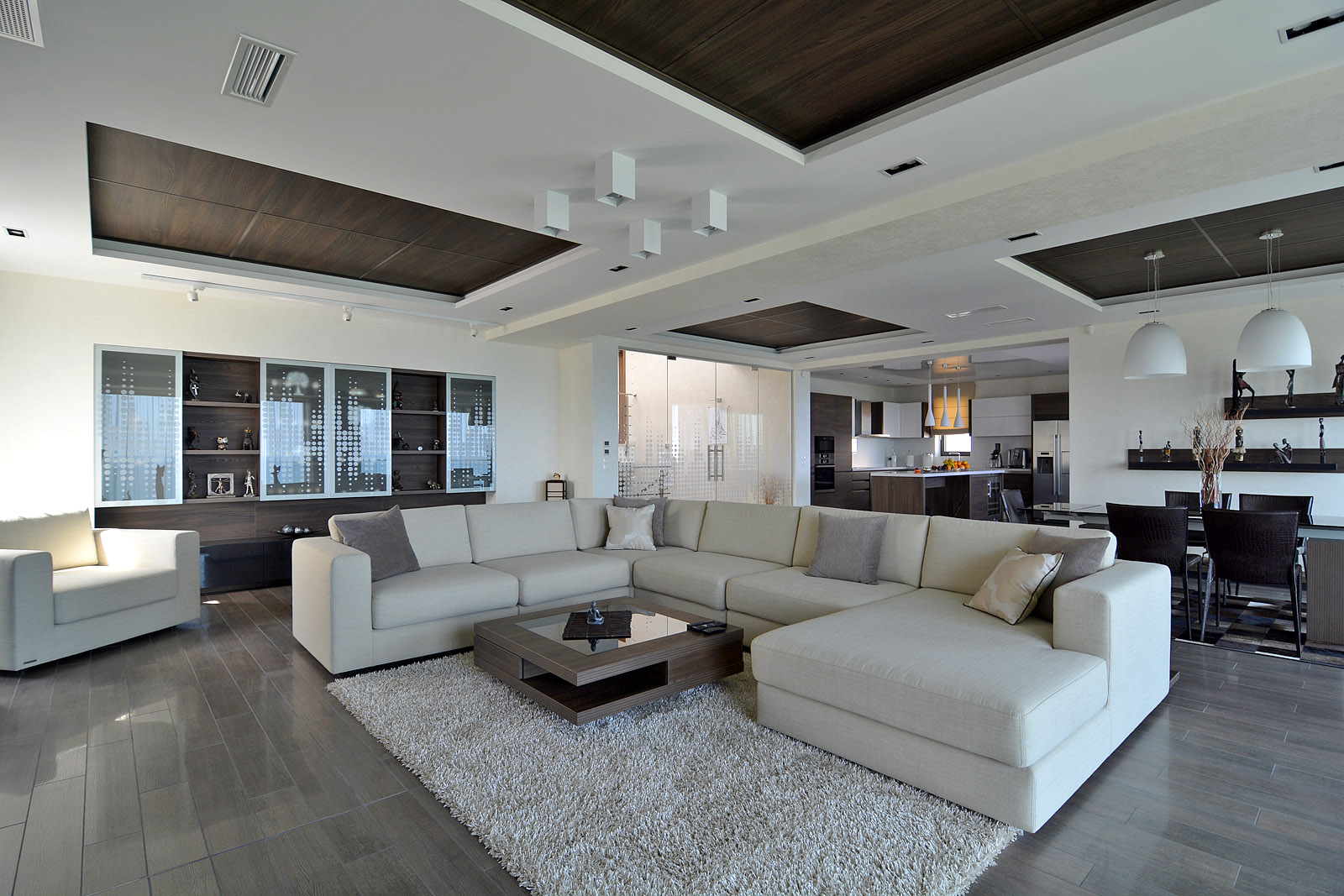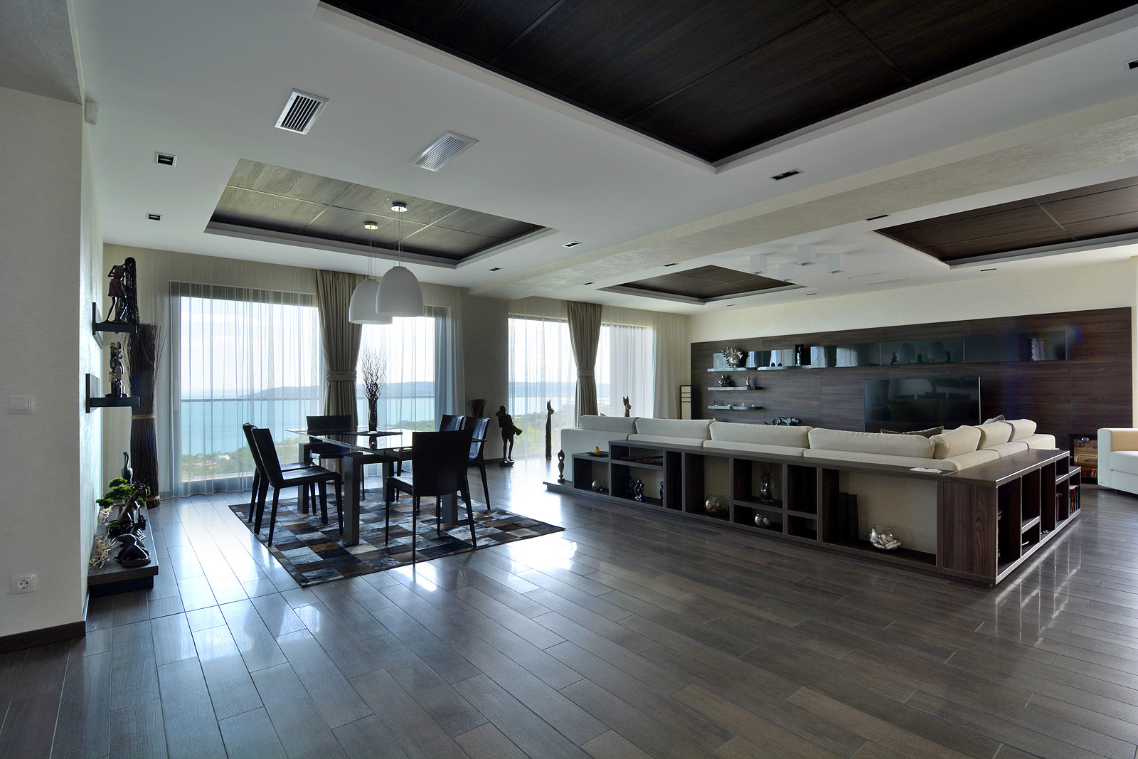 Следва трето полуниво – стая за гости, перално и котелно помещение. Дневното пространство е разположено на четвърто полуниво, с прекрасна панорама и излаз към веранда с барбекю, чийто комин същевременно се явява и част от носещата стоманобетонна конструкция.