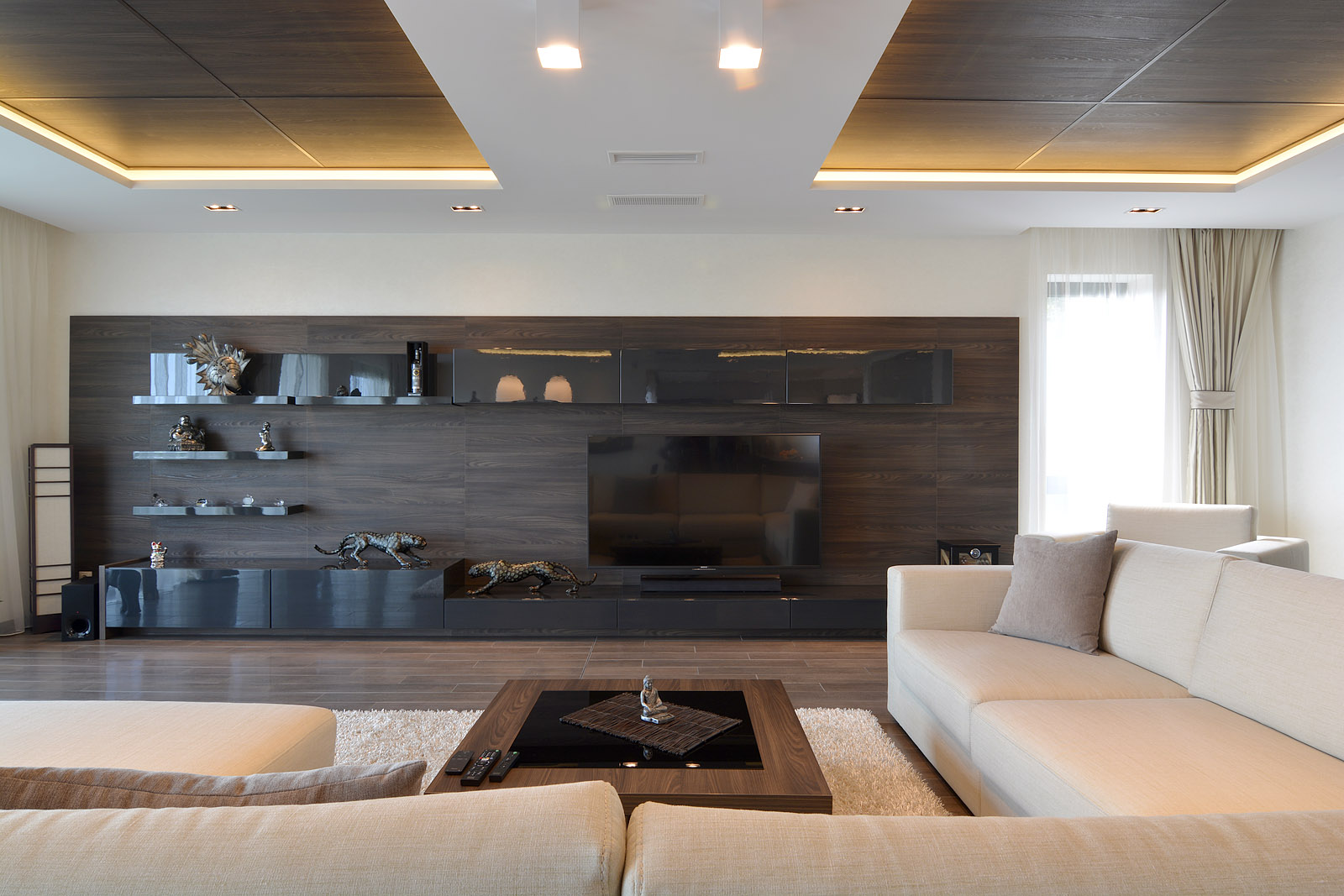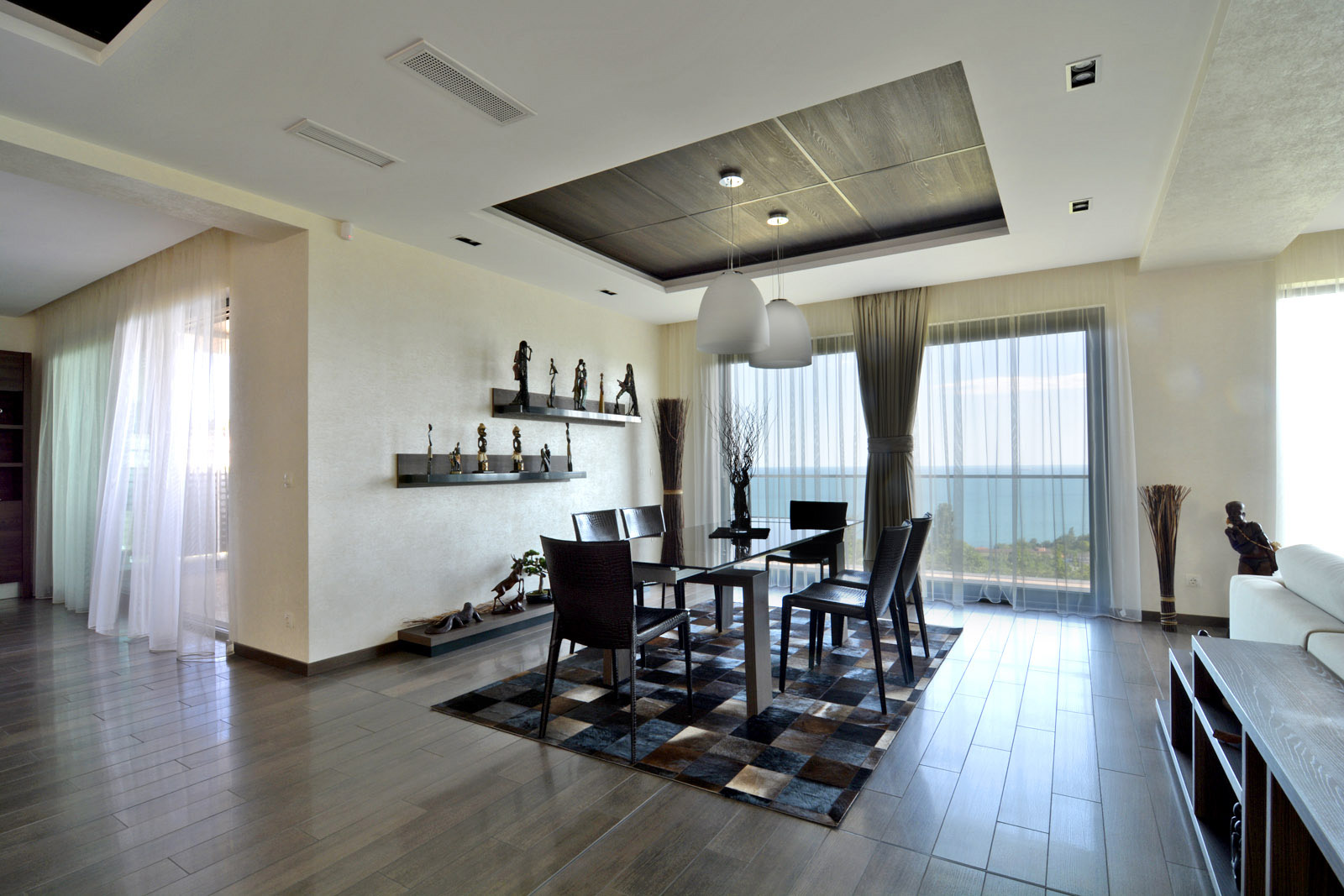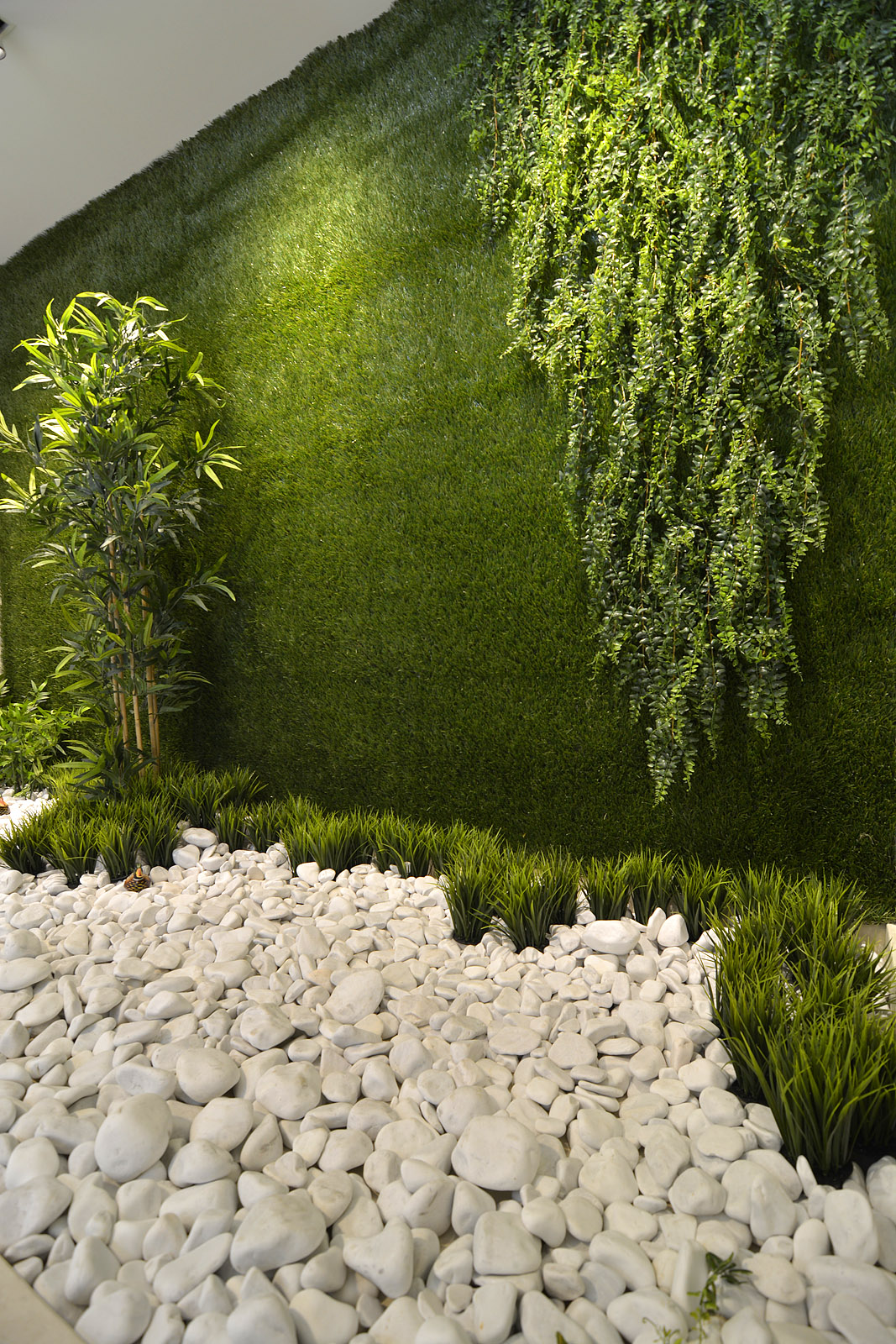В интериорът са заложени топли и земни тонове и естествени материали – бежово, кремаво, кафяво. Естествената зеленина пристъства и в самата къща – зелено пано и декоративни бели камъни създават невероятно усещане за спокойствие и чистота.