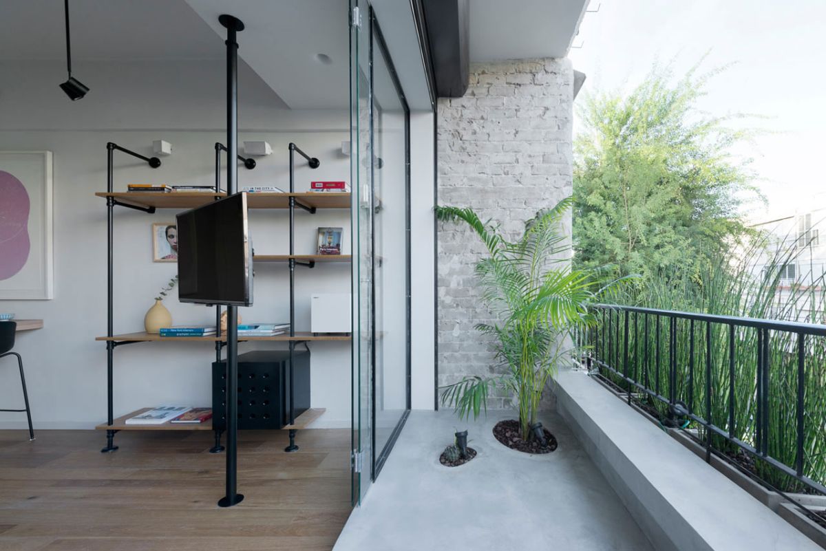 Фактът, че апартаментът е с открита тераса, още повече помага да се засили усещането за простор. За да се подчертаят гледките и да се внесе повече естествена светлина в жизненото пространство, дизайнерът е избрал да се раздели балкона от вътрешния обем с плъзгащи се стъклени врати. В същото време, балконът има дзен облик, отличаващ се с бетоненна платформа с вграден плантатор.