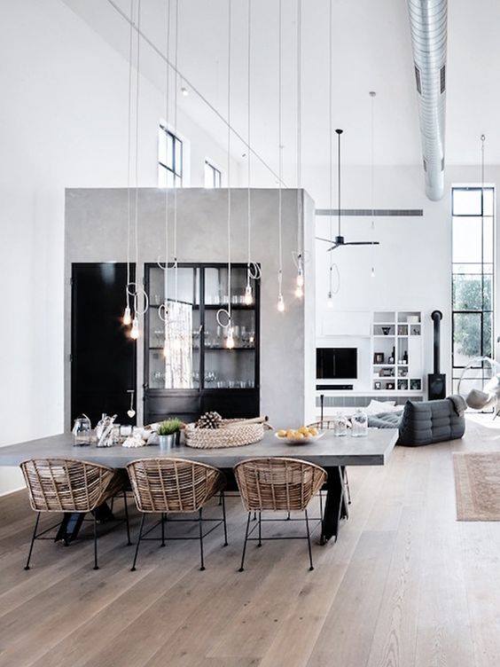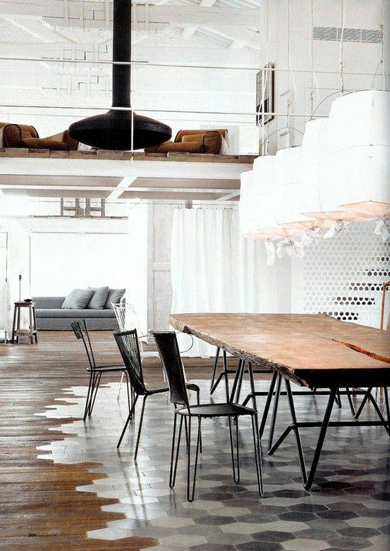 В края на краищата, килимите не са най-подходящият материал за фабрики. За предпочитане са твърди подови настилки от дърво или бетон, тъй като те създават чист вид на индустриално пространство. Ако пък са малко износени, толкова по-добре. Означава ли това, че една или две черги са изключени? Категорично не! Няма нищо лошо в това да добавите малко топлина под краката си, но трябва да се има предвид студената палитра и цялостното минималистично усещане.