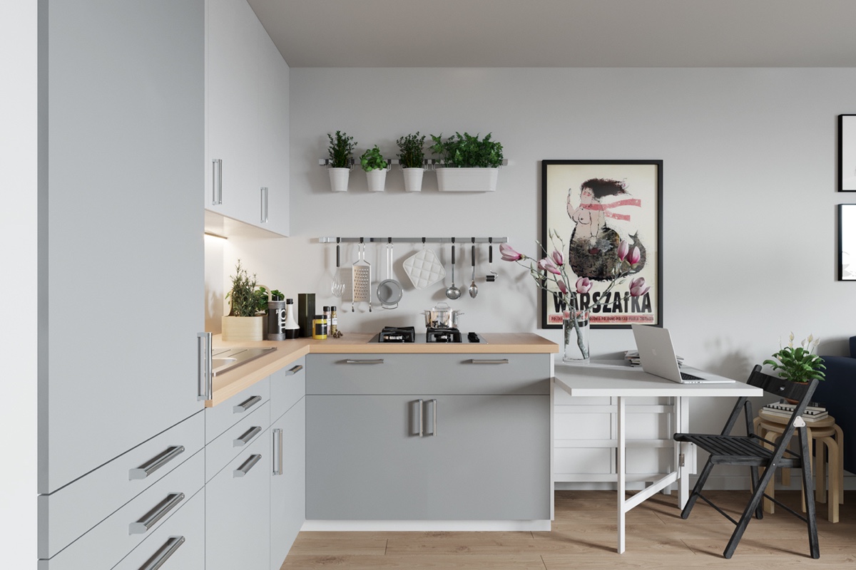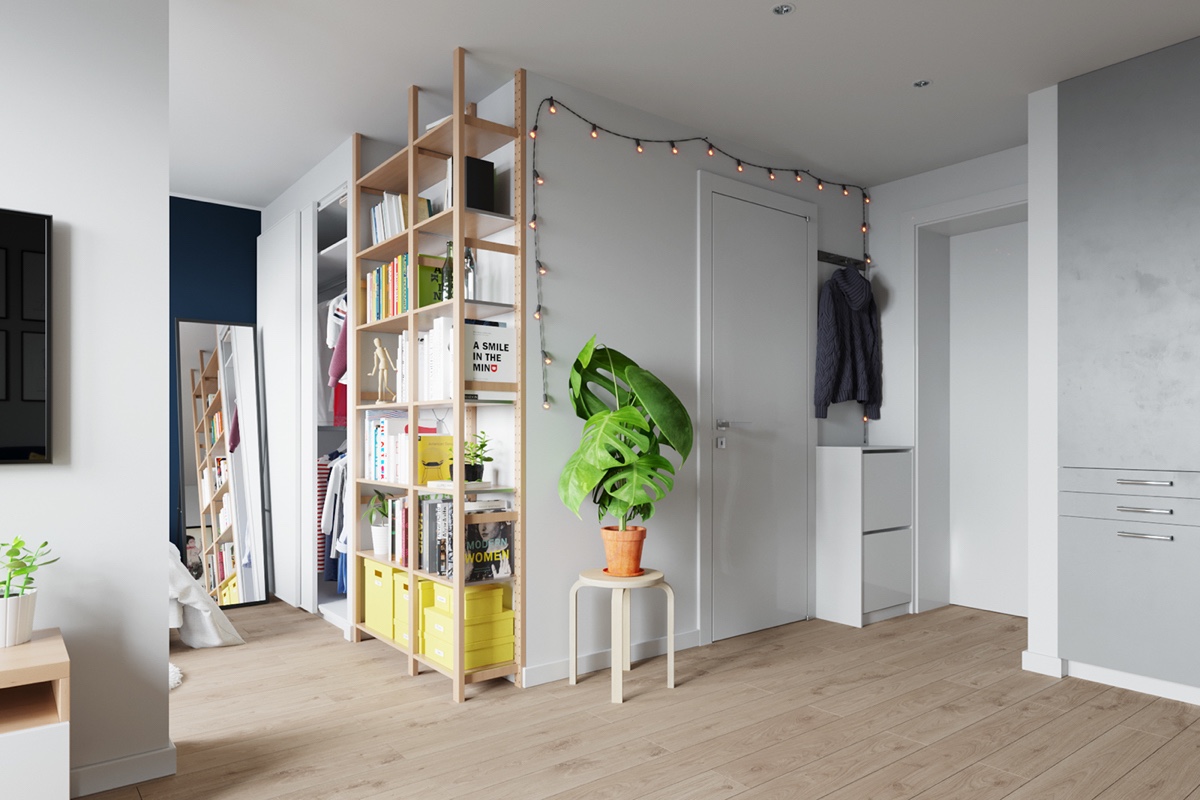 Първият проект се намира във Варшава, Полша и е резположен само на 30 кв.м. Използвани са мебели от ИКЕА – съвременен и светъл, макар и облечена в сиви стени, Изобилие от растения, редица от приказни светлини и функционална скандинавска библиотека – това пространство диша с лекота.