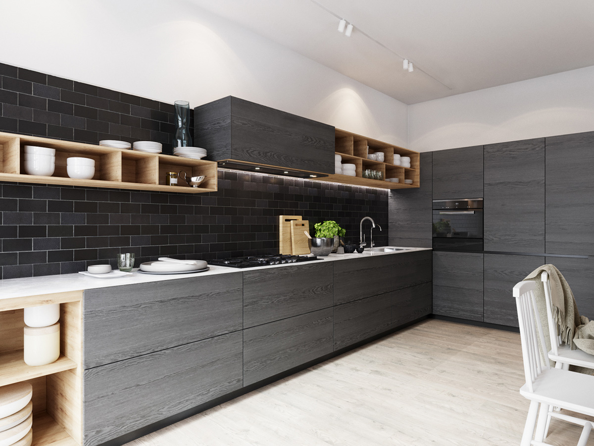 Изчистените и спретнати тъмни шкафове в кухнята са идеалният