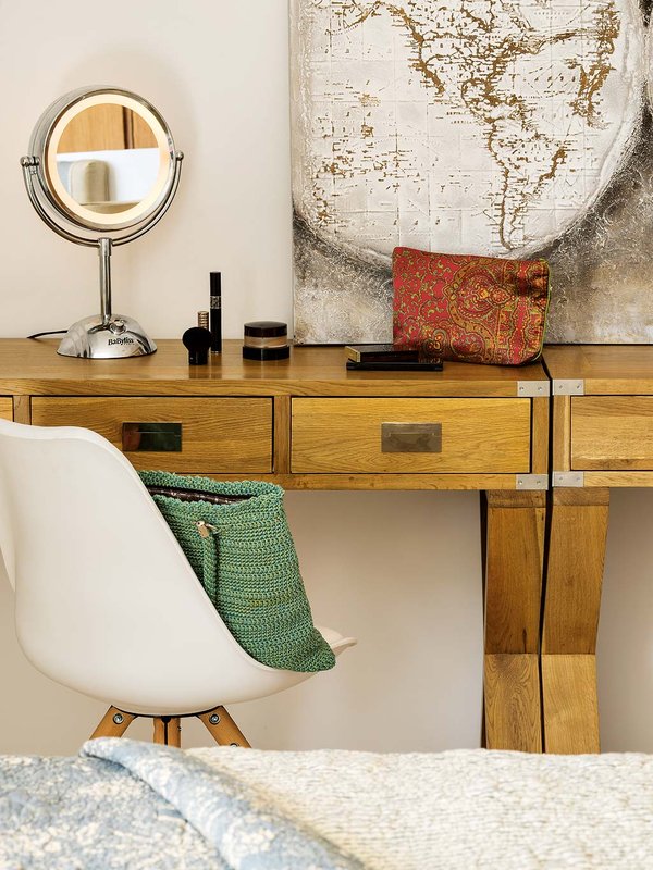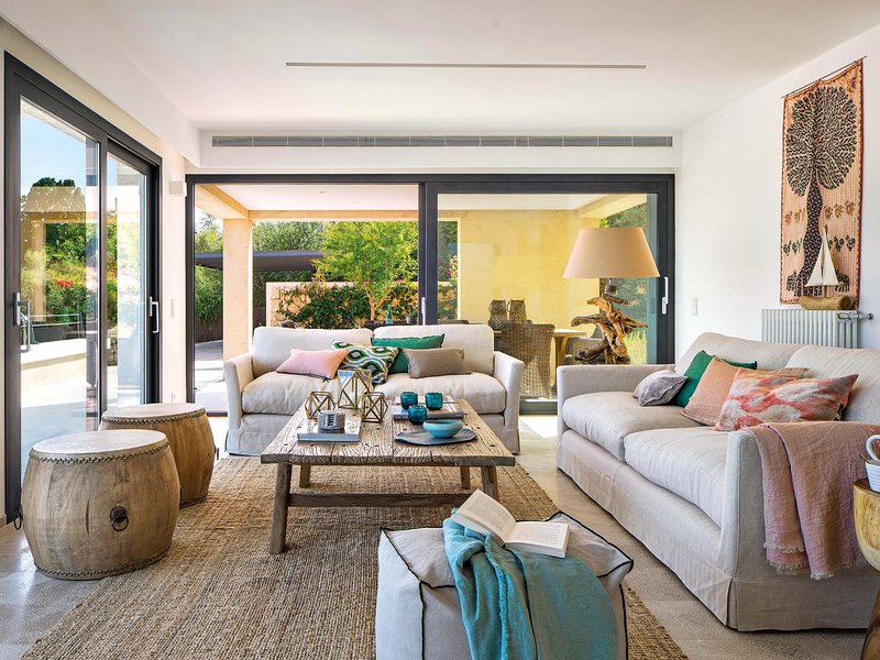 Текстилни пана по стените, килими от груби естествени тъкани, много сурово неполирано дърво, свещници от цветно стъкло, одеяла и декоративни възглавнички. Това е всекидневната! Масата пред големия уютен диван е същинско произведение на изкуството, а тимпаните около нея са приспособени като мебел. Дизайнерският лампион от речен плавей е въплъщение на бохемският лайфстайл. Цветовете на мебелите са дървесни или неутрални, а цвят вкарват само закачливите интериорни аксесоари като възглавници, чашки и свещници.