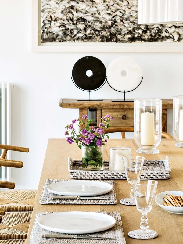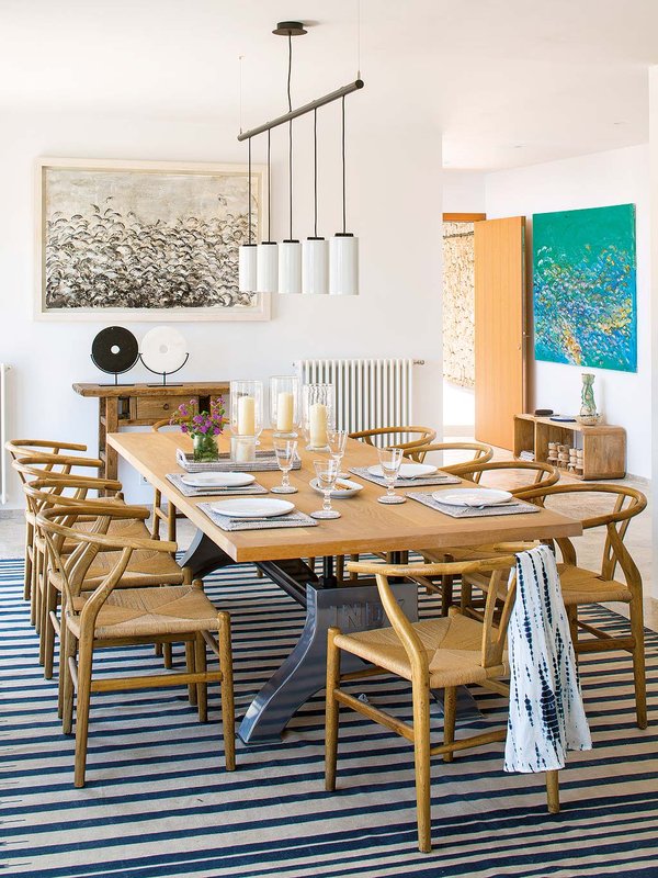 Трапезарията е просторна, снабдена с голяма дървена маса за хранене, където да поканите роднини и приятели на обяд или вечеря. Столовете са с плетени седалки и дървена рамка, а големите картини на стените и килимът в синьо райе съживяват цялата стая и и дават така нужните цветни акценти.