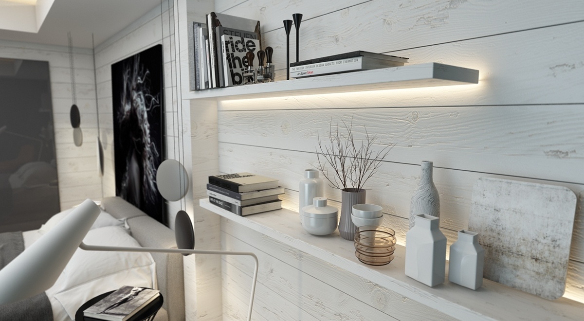 Друг поглед върху стената като акцент в спалнята дава следващият дизайнер, използвайки слоеве от различни материали, естествено дърво и гладки, изглеждащи като плюшени панели зад леглото. Брилянтна идея е също играта с геометрични фигури, различна текстура на стената, поставянето на релефни панели или дори извеждане на акцентите върху две срещуположни стени.