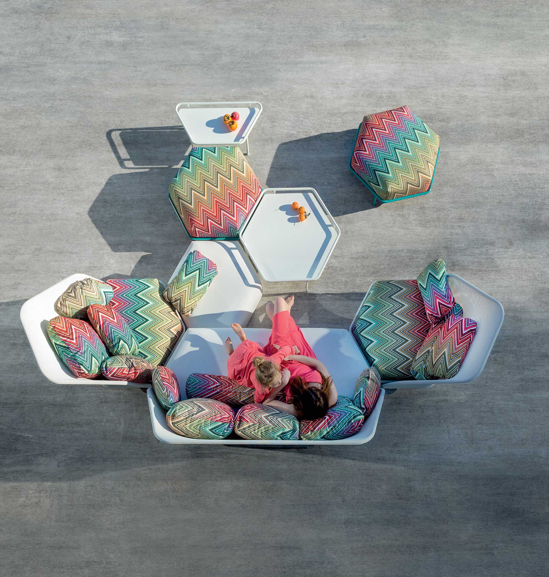 Вземете вдъхновение от тези шестоъгълни форми и – те се вписват перфектно заедно във всяка ситуация. Шестоъгълните парчета мебели са в различни размери. Всяка част допринася за различната употреба на събирането: пейка, няколко шезлонги, няколко маси и табуретка. Като по чудо, парчетата могат да бъдат пренаредени, за да се впишат в различни социални среди.
