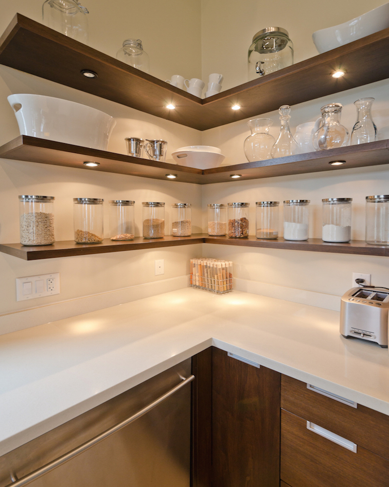 И разбира се, сложете ъглови рафтове в кухнята си, особено ако тя е по-малка. Те ще ви осигурят допълнително пространство за всички онези чаши за кафе и чинии. Добавете няколко осветителни тела над или под тях за още по-неустоим ефект!