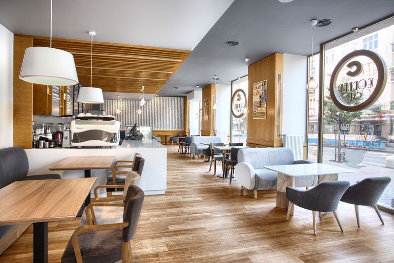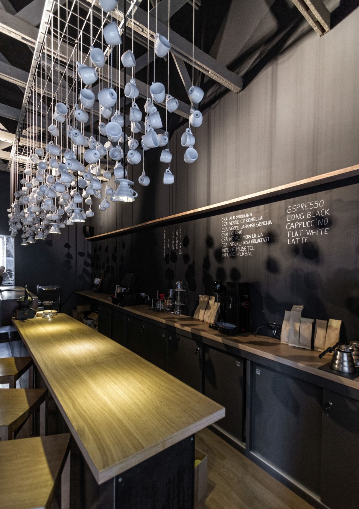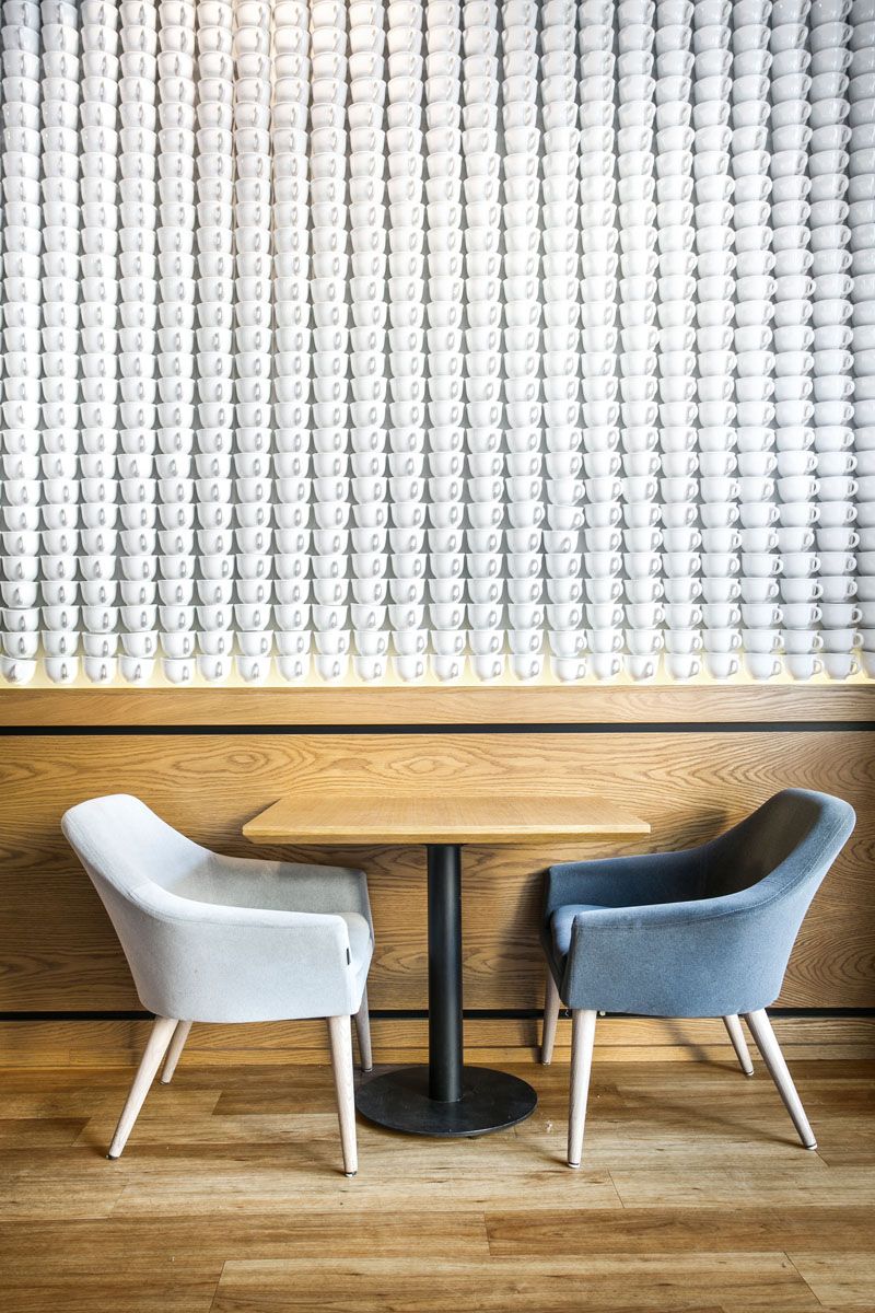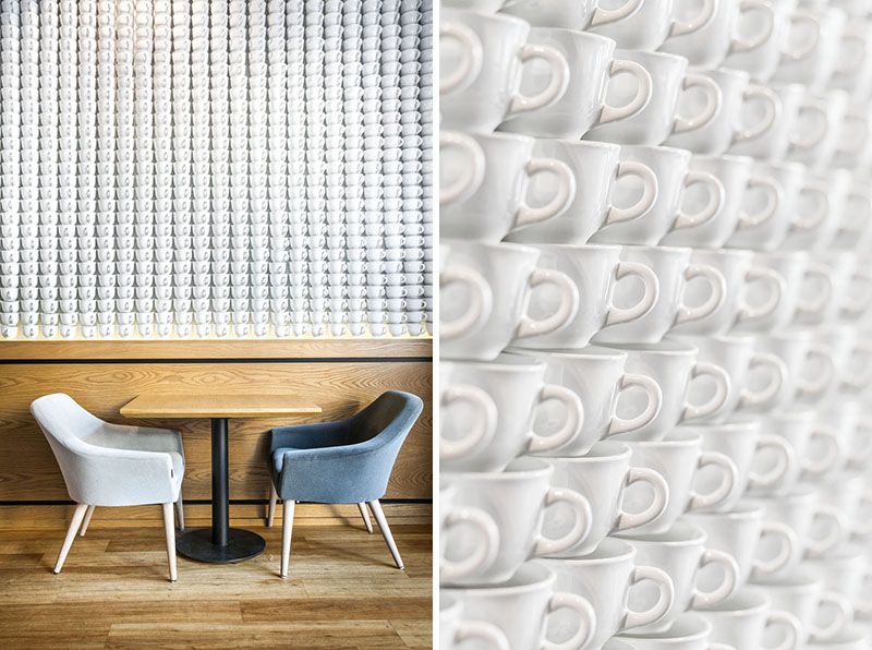 Първият от тях е място в Полша, проектирано от Paulina Czurak Design Studio и общо 2740 чаени чаши са били използвани в процеса. Това наистина е много голямо количество, но от толкова чаени чаши имате нужда, ако искате да създадете таква декорация за стената. Останалата част от декора е вдъхновена от ретро красота и функционални удобни тапицирани столове и мека мебел, дървени маси и подове и стенни плакати.