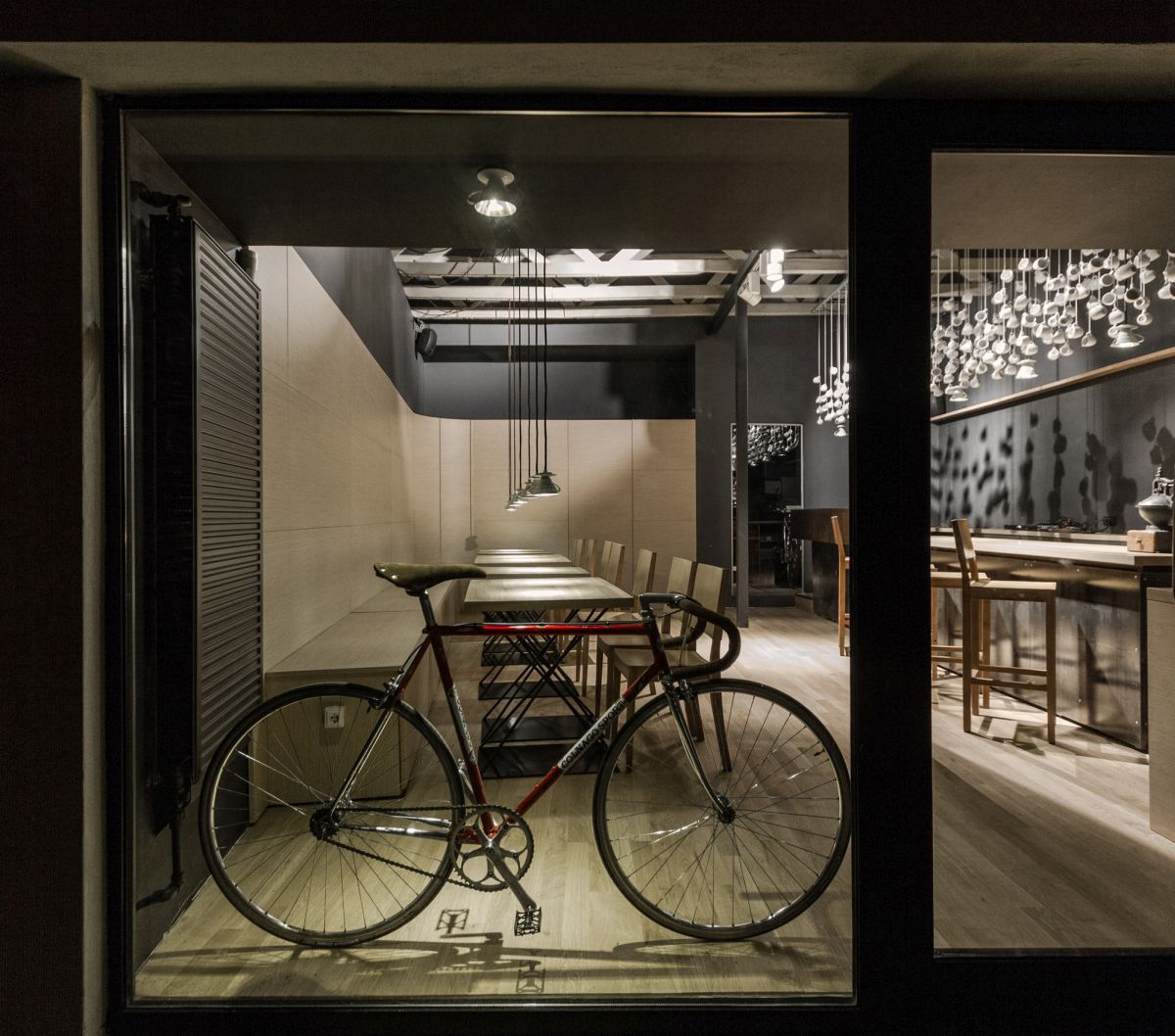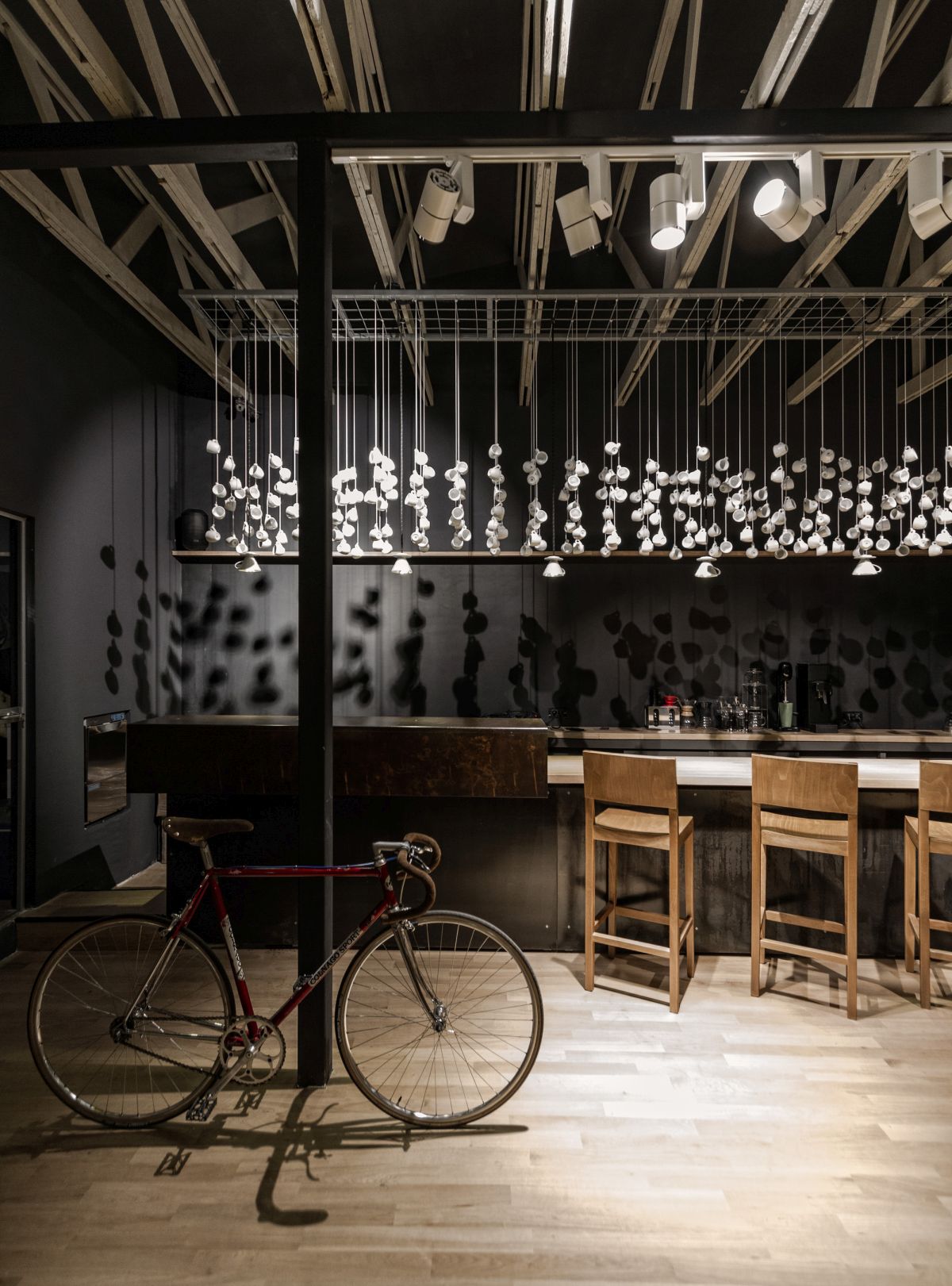 Вместо да бъдат прикрепени към стената, те са провесени от откритите греди на тавана на този обект в индустриален стил. Те приличат на малки висулки и стоят на различни височини над коктейл бара.