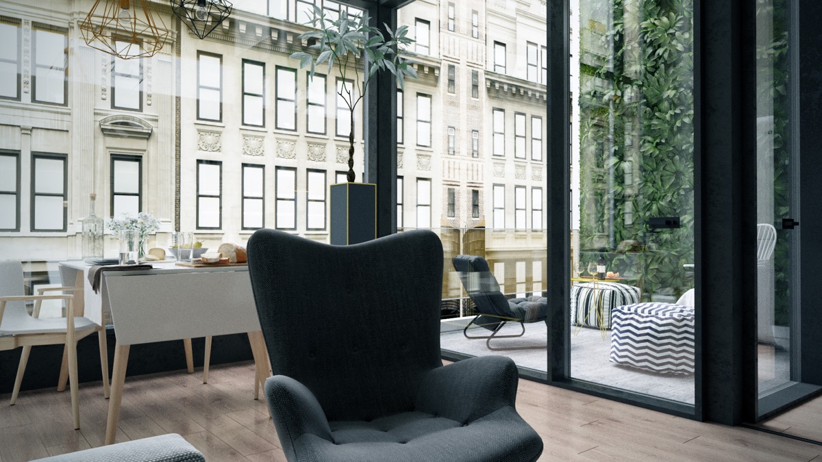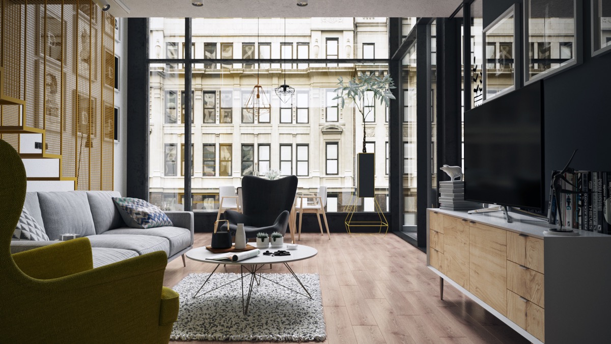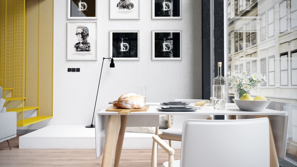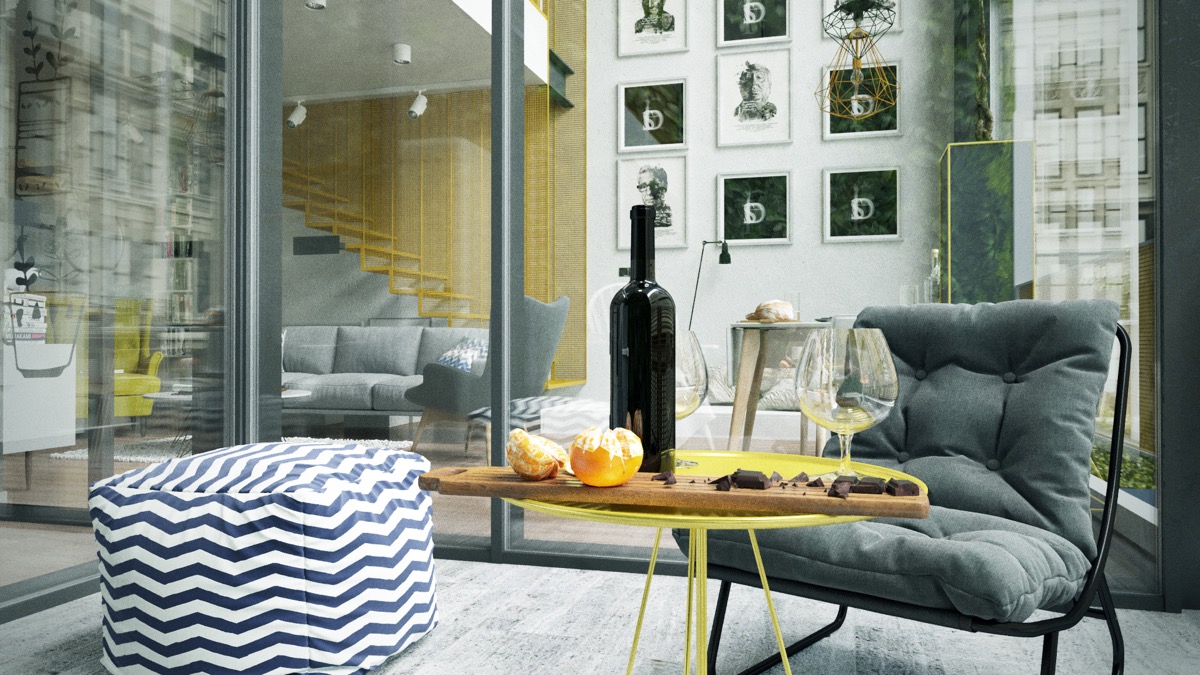Всекидневната и трапезарията споделят едно и също пространство в този дизайнерски апартамент. Стъклените стени позволяват на светлината да “залее” интериора. Вълнуващите мотиви и жълтите акценти привличат очите. Жълтата и сива тема обединява външния балкон с интериора.