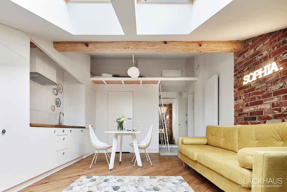 Благодарение на великолепните прозорци и впечатляващата височина на тавана този дом не се чувства ограничаващ – но самият етаж е изненадващо компактен. Това жилищно пространство се стреми да създаде комфортна обстановка с креативни техники на оформление, включително скрита спалня на платформа близо до входа на апартамента.