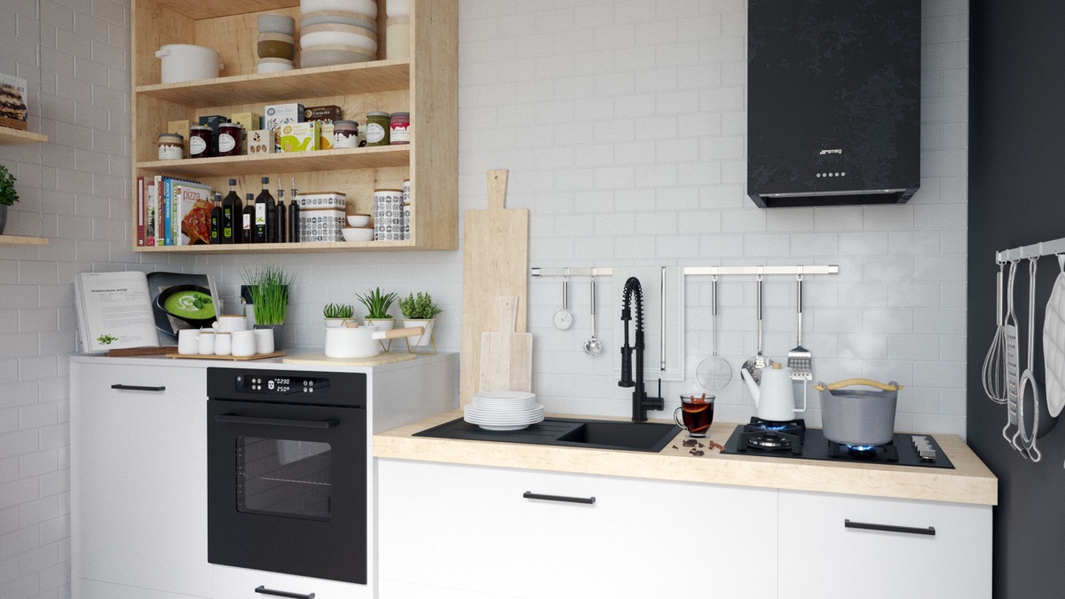Компактната кухня предлага няколко вдъхновяващи техники за спестяване на пространство, като например разгънатата работна маса и атрактивните отворени рафтове. Атрактивните прибори за хранене и съдове за готвене са задължителни, когато става дума за кухни с открито място за съхранение. Дори и дъските за рязане са красиви – и със сигурност ще се окажат полезни с наличието на тази билкова градина! Малки подробности като тези могат да направят всичко различно в подобен интериор като този.
