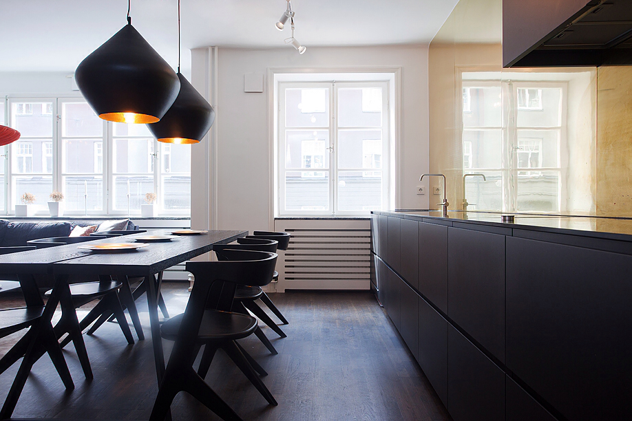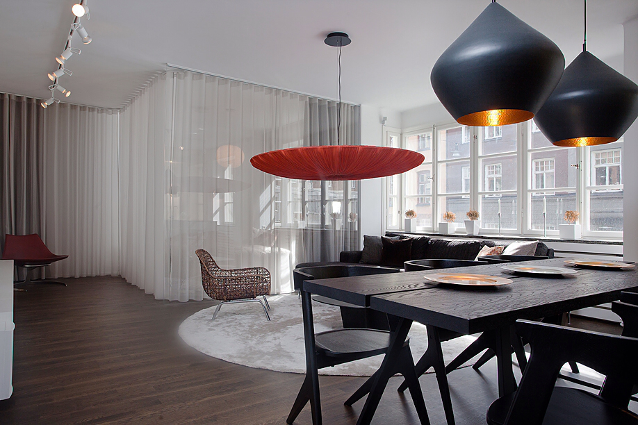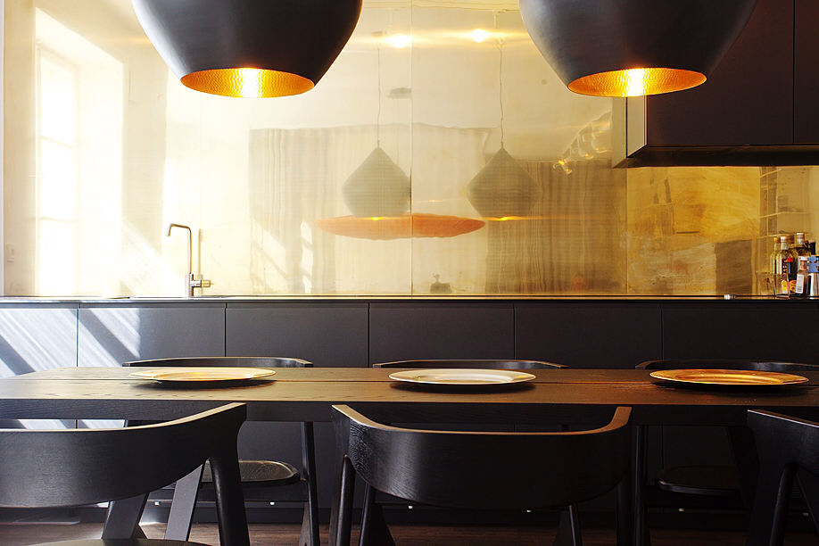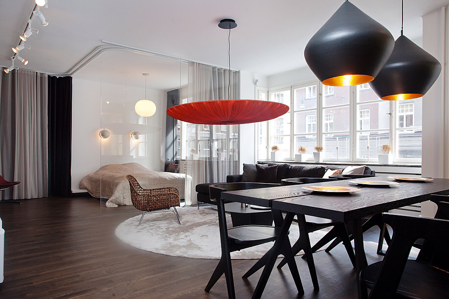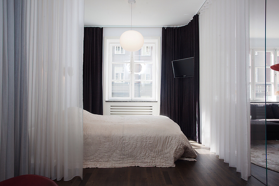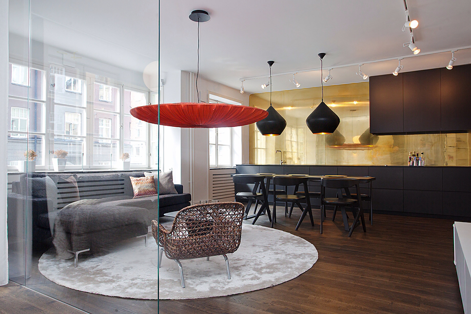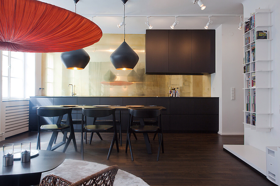 Този апартамент на мен много ми хареса, въпреки факта, че аз не обичам злато. Удивително, но той е точна реализация на старите ми идеи за разделяне на зоните със завеси. За съжаление този мой проект отдавна е замразен, но сега аз виждам, че идеята е добра! Насладете се на баланса на светло и тъмно.