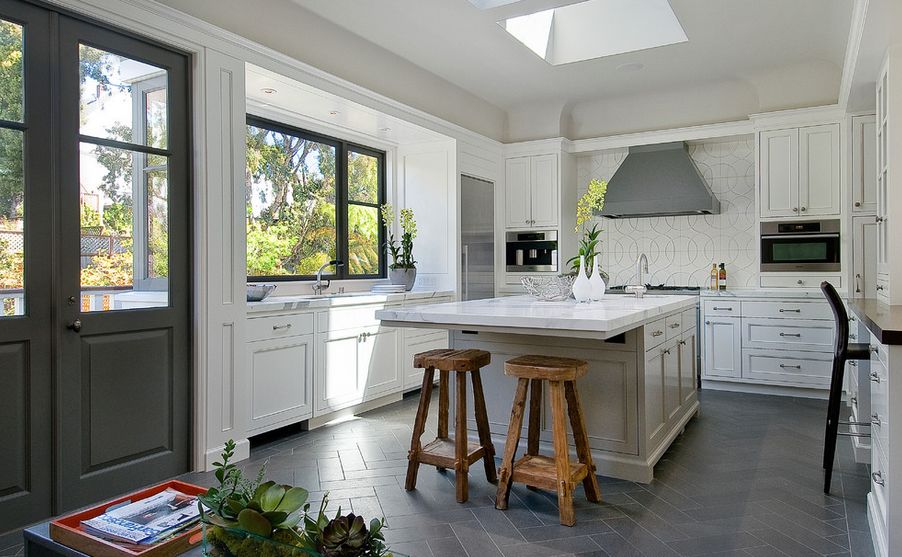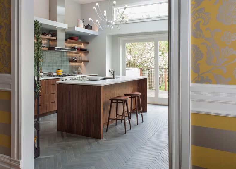 Най-често слагаме плочки на пода в кухнята, тъй като те са по-здрави и лесни за чистене. Но паркетът също е опция. Така кухненския интериор ще бъде по-топъл и по-интересен. Виждали сме и бани с паркет, но добре обмислете проблема с влагата преди да се спрете на този вариант. Ако държите все пак на тази шарка, просто заменете дървения под с плочки в тази шарка.