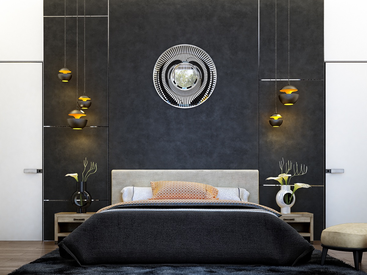 Тези черни акценти за стените и зашеметяващо дълбоки акценти са впечатляващи. Макар че много дизайнери предпочитат да проектират интериори в леки и светли пространства, не можем да отречем стилния и луксозен вид, както и смелото изпозлване на черно, които заемат централно място в тази колекция от спални.