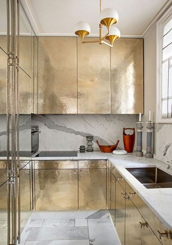 Златните цветове носят ефектен блясък и топлина в модерния интериорен дизайн. Тенденциите включват златни цветове като интериорна боя, керамични домашни декорации, домашни тъкани и модерни дизайнерски плочки в златисти цветове. Златните цветове са смесени със съвременния дизайн и иновативни форми като помещенията изглеждат по-релаксиращи.