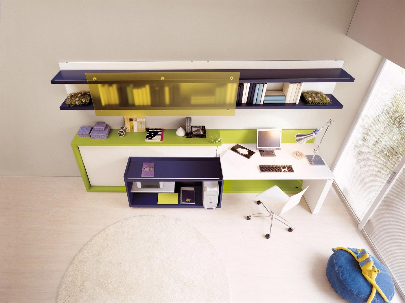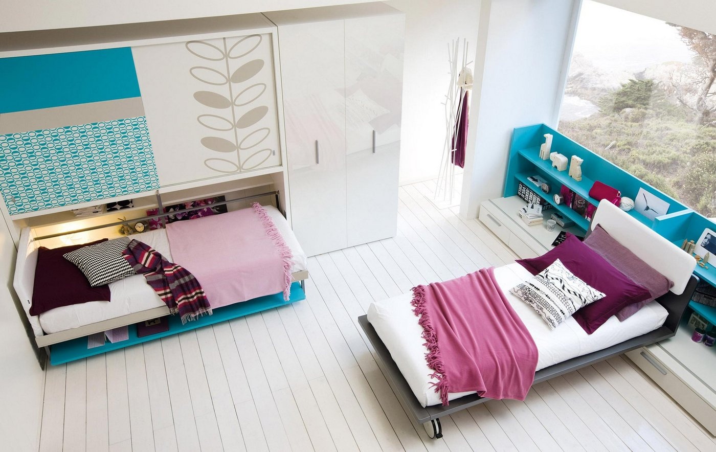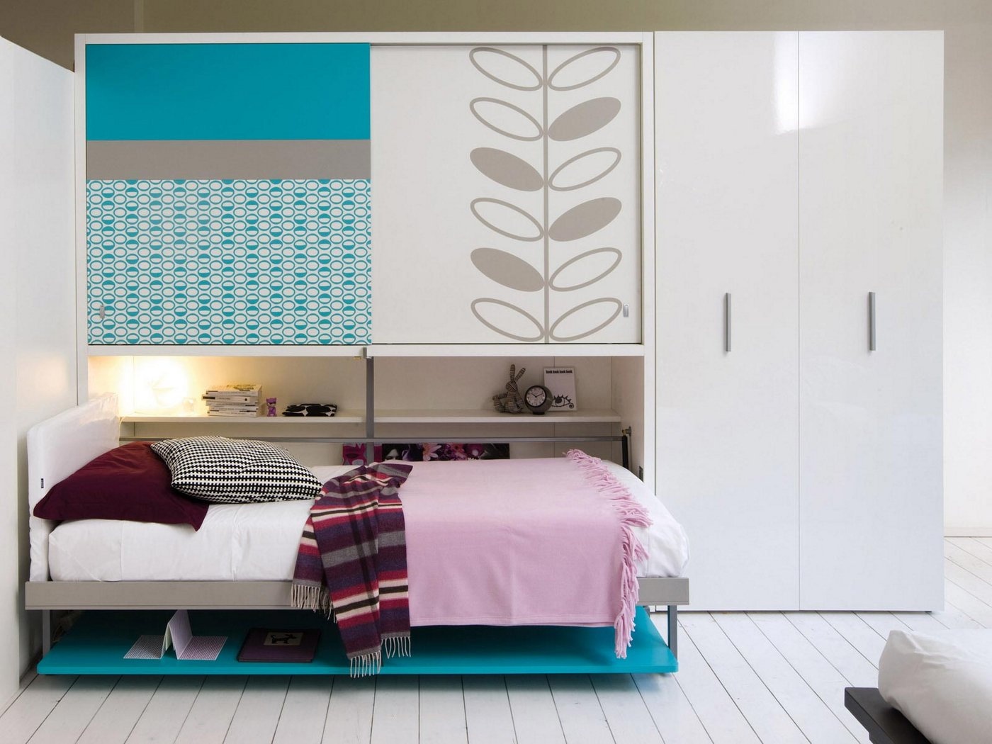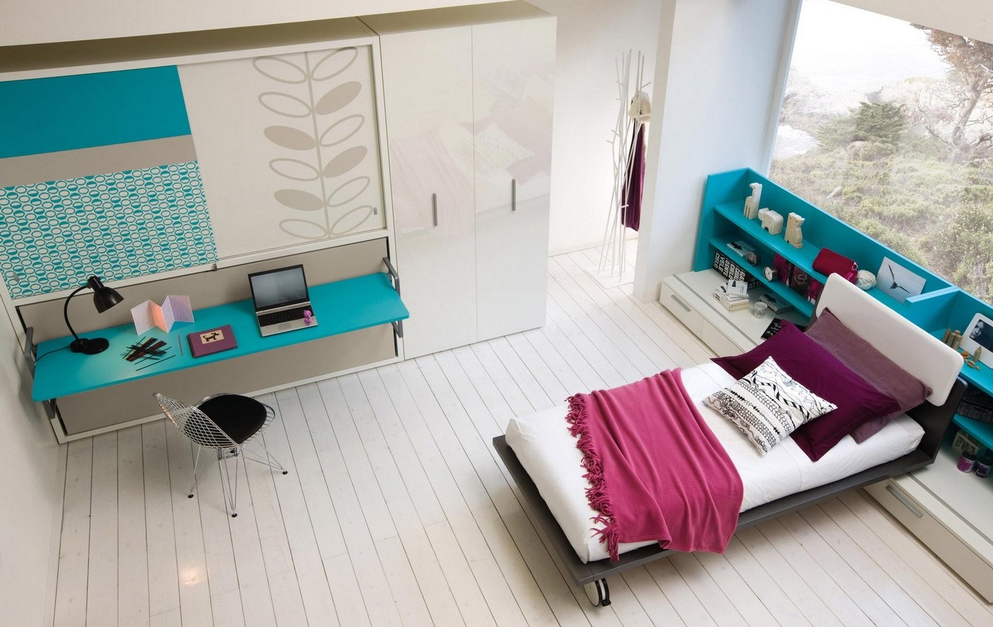 Контрастът на смели цветове като розово, неутрално бяло и сиво запазват тази тийнейджърска стая младежка и игрива, без да е излишно ярка. Когато е напълно разкрито, падащото легло е здраво и удобно, докато бюро е внимателно скрито. С много рафтове, стаята на това момиче е както стилна, така и практична. Когато лъскавото тюркоазено бюро се сгъва, за да разкрие тайната на леглото, стаята се превръща в идеалното място за отмора . Под леглото остава област съхранение. Минималистичното бюро не може да има много функции, но това го прави по-лесно да се поддържа чисто.