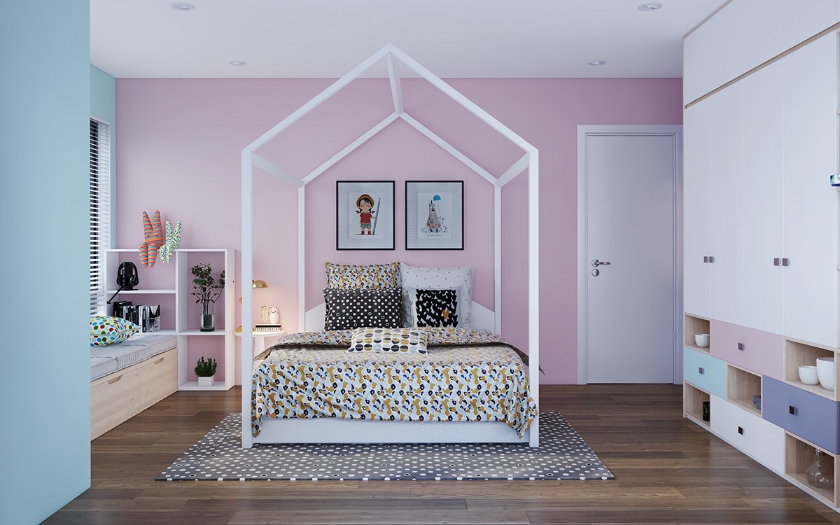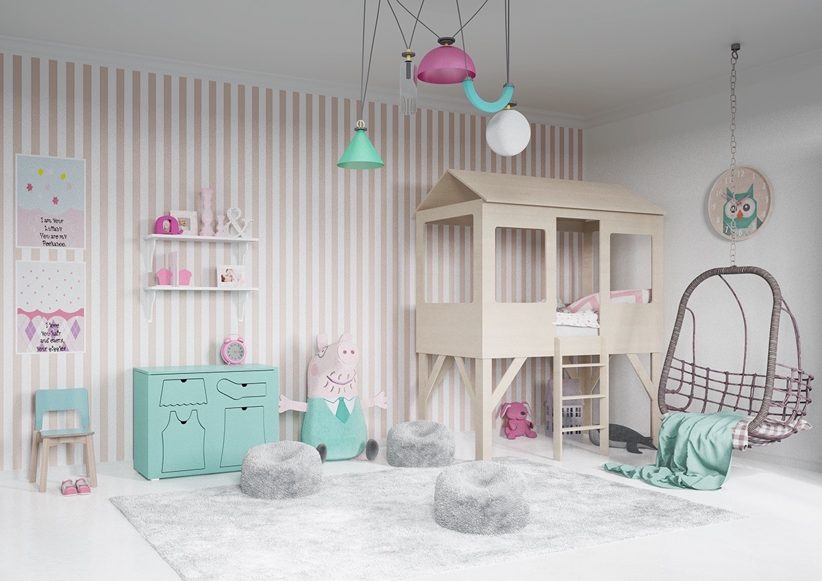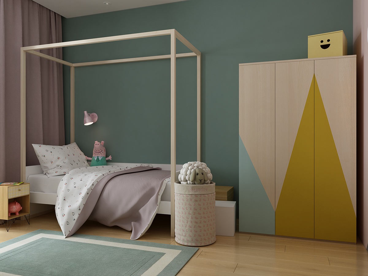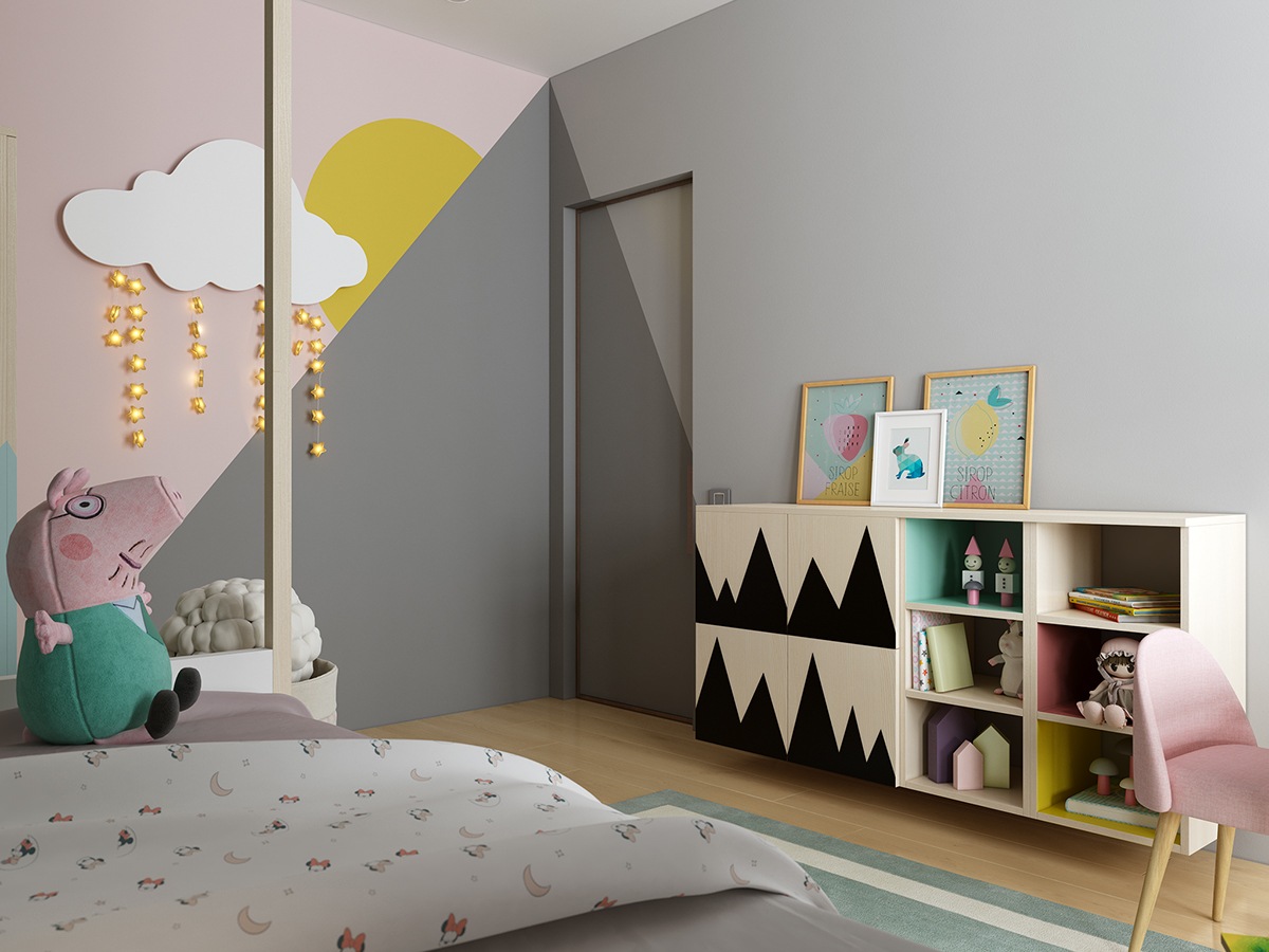 Тази спалня използва предимно минималистичен подход в сравнение с предишния, но това не е рязък вид на минималистичния дизайн. Този стил демонстрира свежа и чиста естетика с много място за въображение. Ярки жълти акценти изкачат от фона на синьо и пастелно розово, с очарователни животински знаци, които ни подтикват към незабавни усмивки…