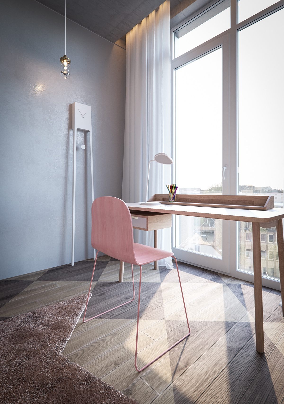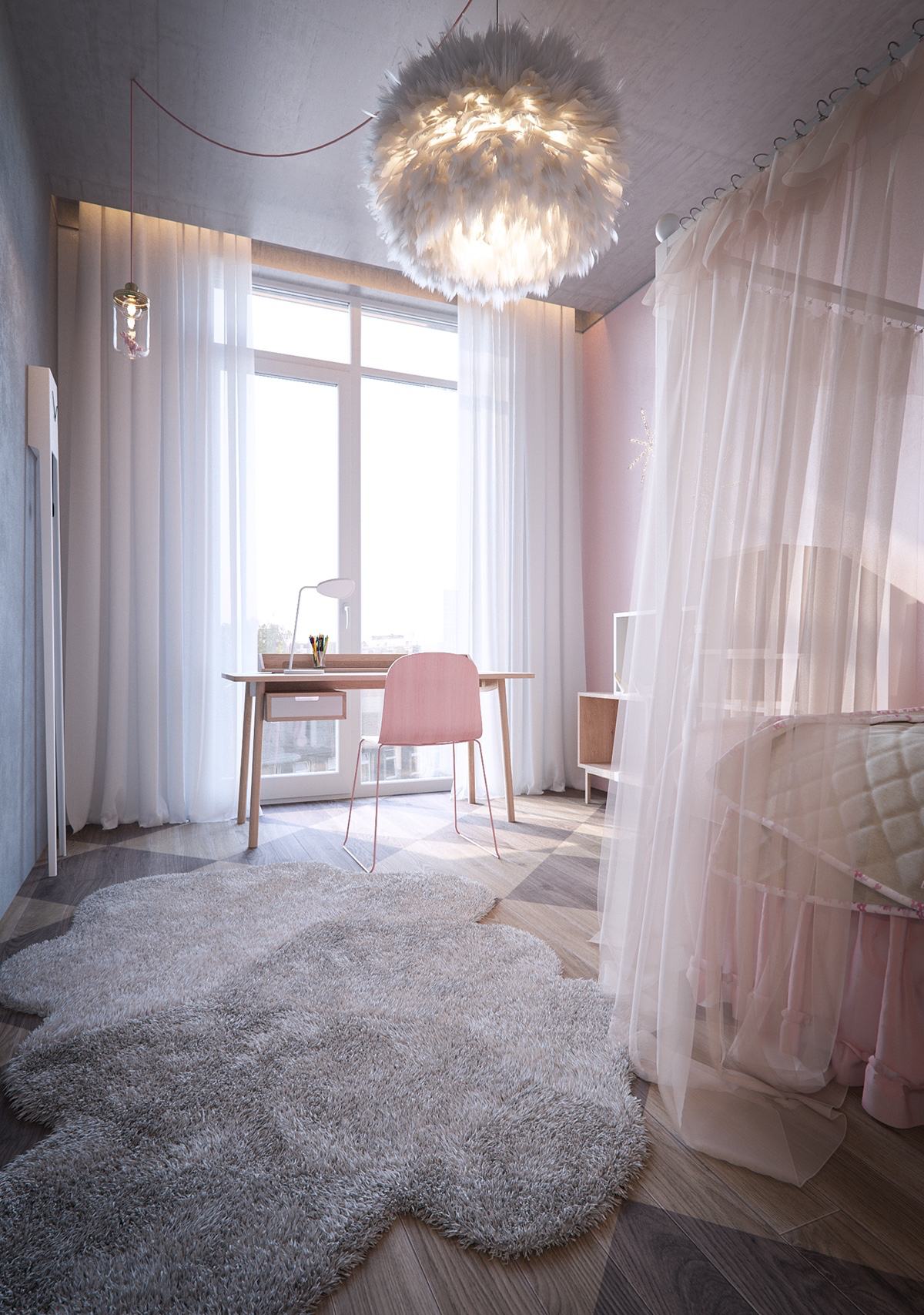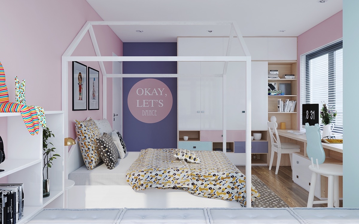 Тази спалня използва предимно минималистичен подход в сравнение с предишния, но това не е рязък вид на минималистичния дизайн. Този стил демонстрира свежа и чиста естетика с много място за въображение. Ярки жълти акценти изкачат от фона на синьо и пастелно розово, с очарователни животински знаци, които ни подтикват към незабавни усмивки…