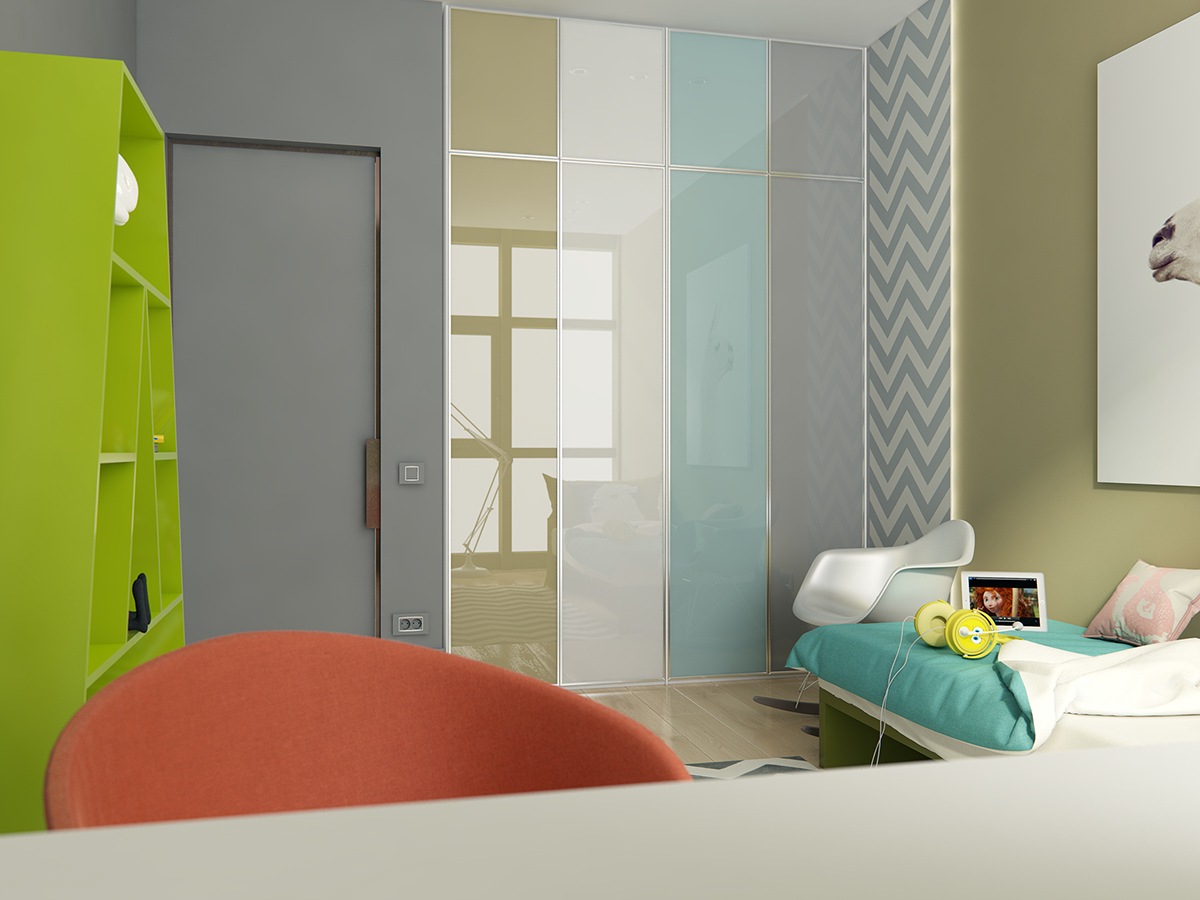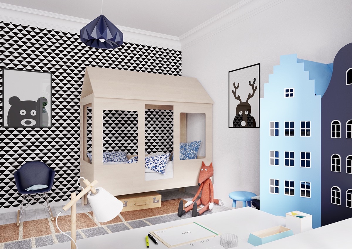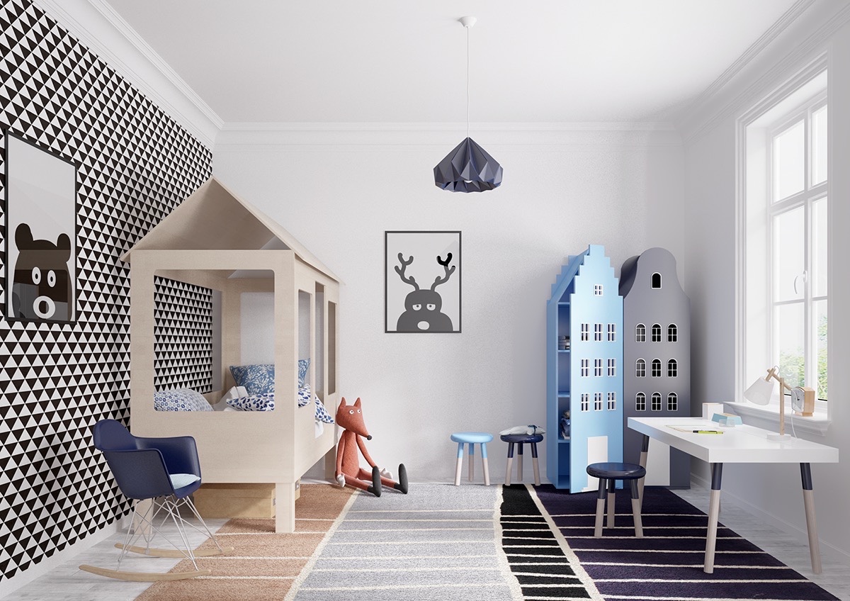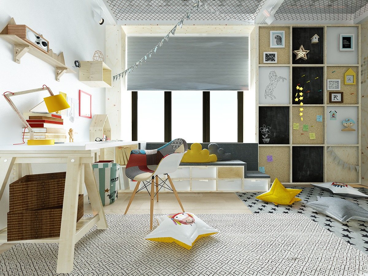 Цветовото блокиране е огромна тенденция тази година в модата и дизайна. Това е свързването, използването на два или три напълно различни цветове заедно, за да се направи смело изявление, акцент. Тъкмо тази тенденция е отличаваща се за това функционално пространство. Реалистични и анимационни герои съставляват голяма част от цялостната декоративна тема. И, разбира се, няколко игриво странни избора се открояват. Портретът на лама е неочакван. А рафтът в зелено с книжки е безспорна фокусна точка на стаята.