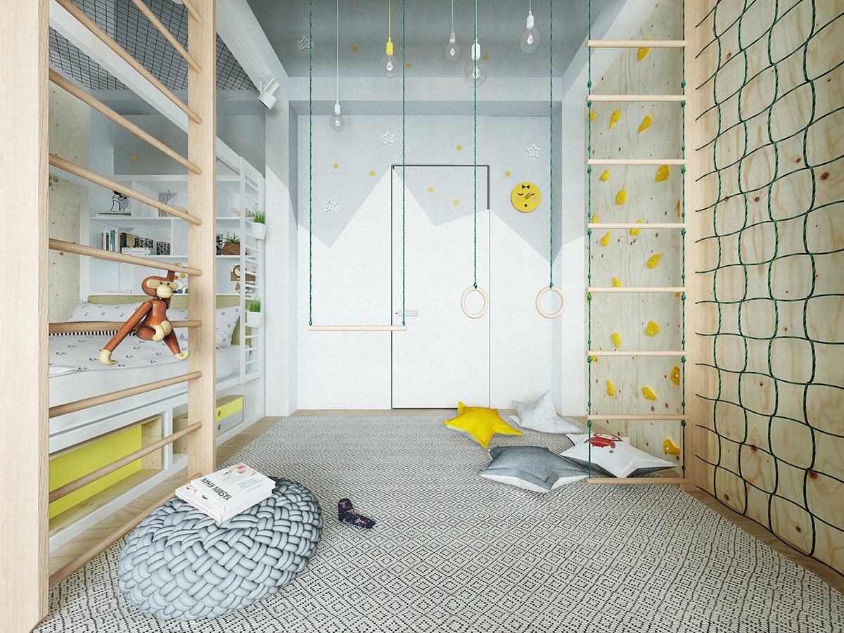 Колоритна и еклектична, тази спалня със сигурност ще се хареса на младите момчета и момичета, дори тийнейджърите може тайно завиждат на някои от по-творческите функции в рамките на това пространство. Един поглед върху останалата част на стаята разкрива фитнес зоната, която предлага забавен начин детето да се упражнява и тренира. Картата на света прави страхотен акцент на стената, а има и образователна функция. Бели дъски за творчески дейности. Дори зоната на леглото може да предложи творческо вдъхновение. Рафтове, къща за книги с приказки, сладки саксии висят от стълбата.