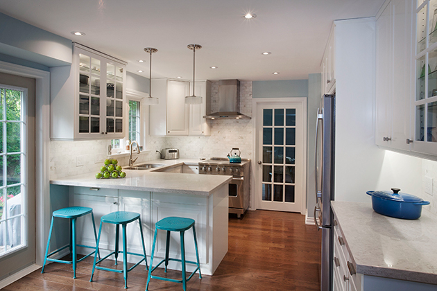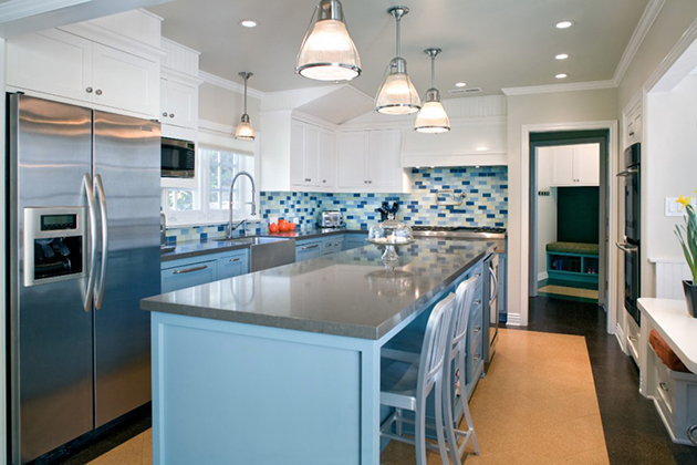 Ето още една прекрасна идея за използване на светло синьо от дизайнера Caesarstone. JWT Associates са реновирали тази кухня на бунгало в Лос Анджелис с пепелно сини шкафове, декоративни керамични плочки и обикновен кухненски плот.