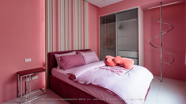 Този изтънчен дизайн използва няколко нюанси на розовото, включително магента, червеникаво розово и розова сьомга. Създава се игривост и шик. Извитият пилон в ъгъла е решетката за дрехи, превръщайки окачените дрехи в произведение на изкуството.