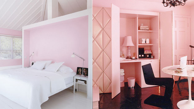 Нека да преминем към другия цвят – кварцово розово. Розовото е универсалeн цвят без значение какъв е тенът на кожата ви – ето защо често ще откриете цвета, използван в “напудрени” кокетни стаи или романтични ресторанти. Леките розови акценти на стената в спалнята са страхотни. В съчетание с бял цвят помещението изглежда свежо, но не кукленско. В другата розова стая се залага на няколко добре поставени черни акценти.