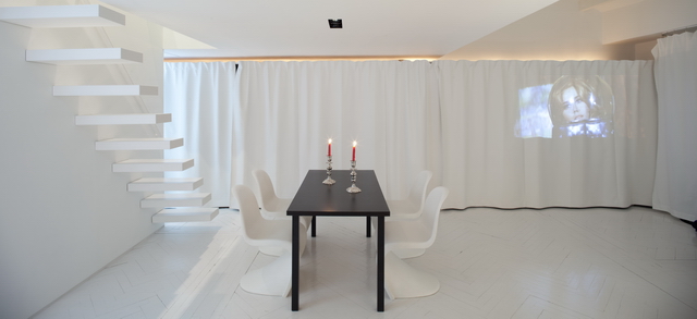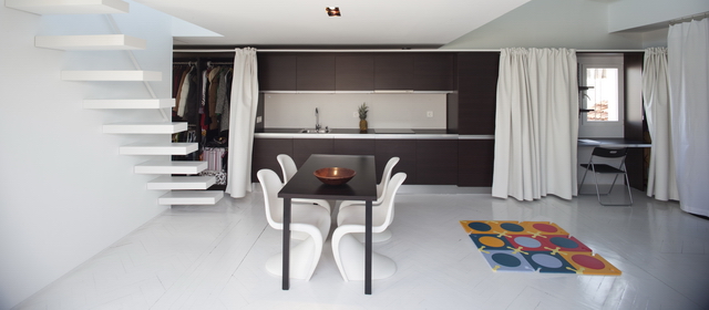 Този малък апартамент предлага: просторна трапезария, хол (докато има и други области за различни дейности, скрити зад кожена завеса), кухня в центъра, работно пространство, и гардероб. Банята е скрита зад семпло стълбище.