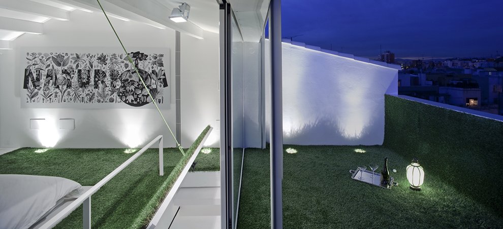 Представяме ви този малък апартамент – мезонет на два етажа – в центъра на Мадрид. Неговата концепция е, че в рамките на 70 кв.м. можем да правим комплекс от дейности, като например да играем голф, да се къпем на открито, да се храним под звездите, да гледаме филм като в киното, да си направим пикник като в парка, да пием в коктейл бар по залез , както и много други дейности, докато всъщност се намираме в една сграда, в центъра на града.