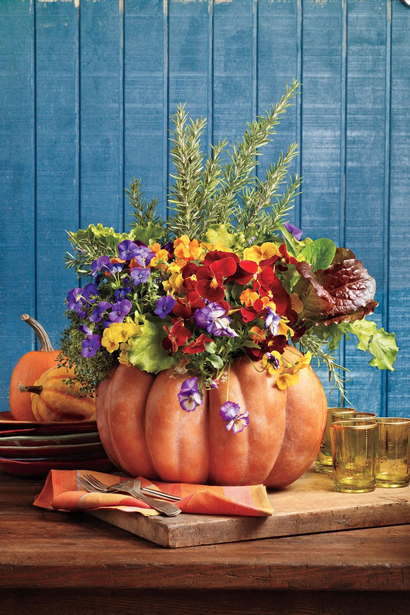 За да направите това, изберете любимата си тиква и вземете теменужки, виолетки, маруля, мащерка и розмарин, за да украсите. Почистете тиквата с кърпа, изрежете отвор в горната част и изсипете семена. Поставте алуминиево фолио или пластмасова торбичка и запълнете три четвърти от нея с почва и растения.
