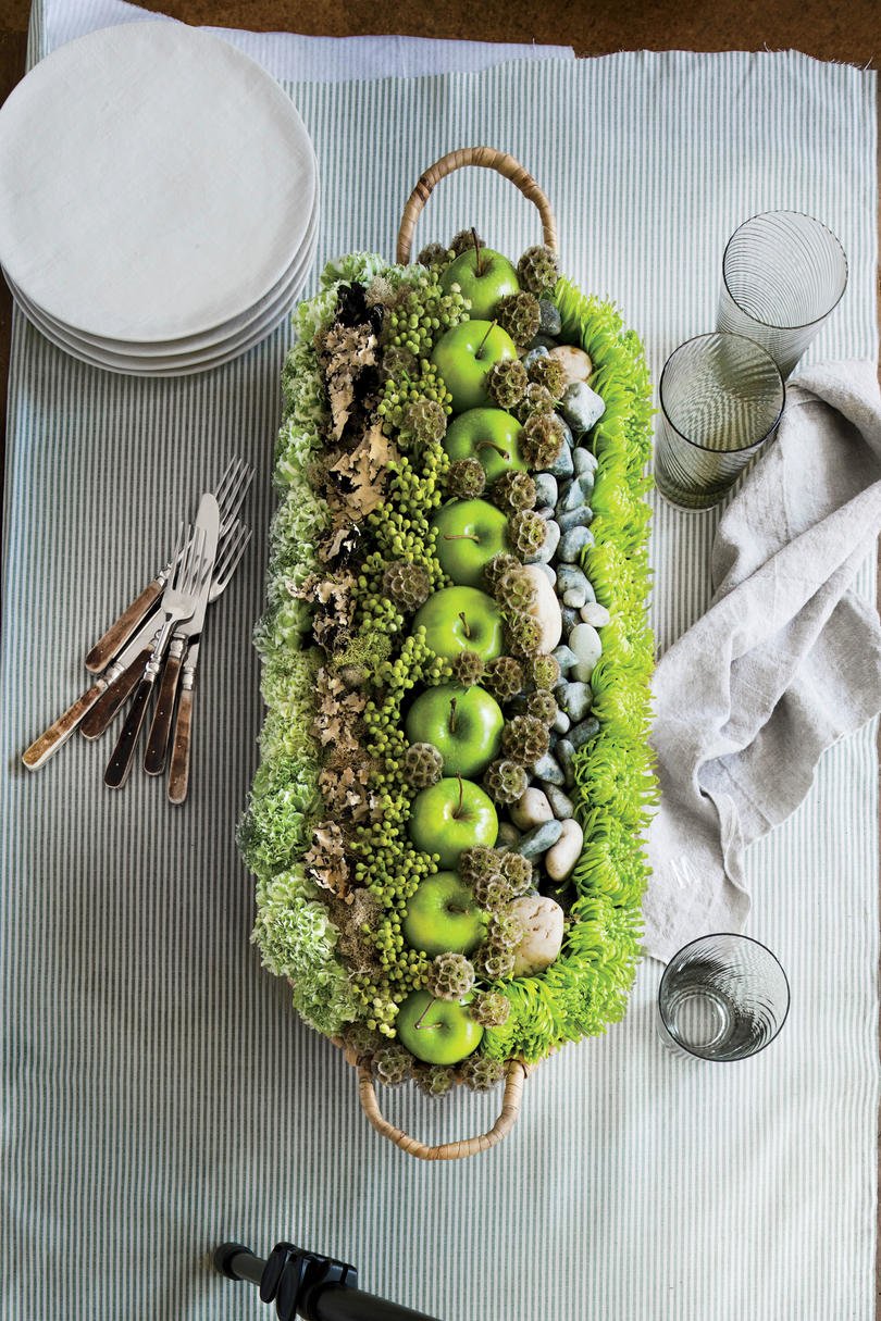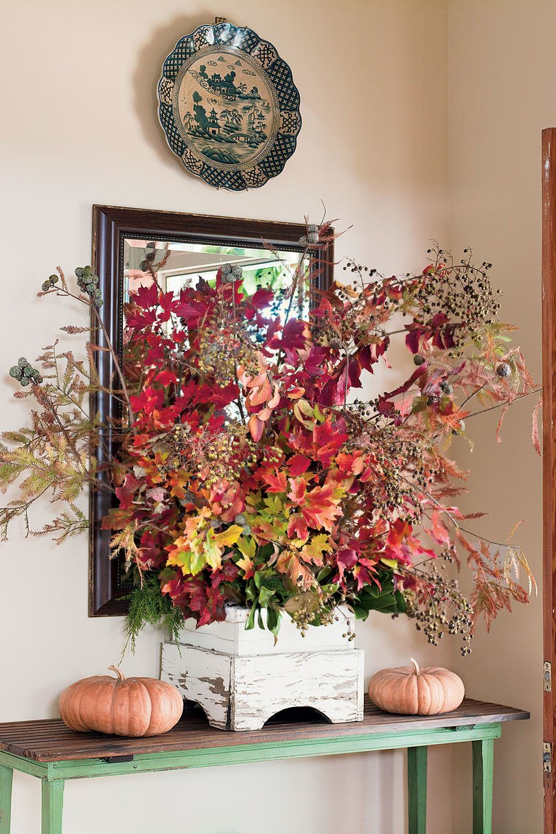 Ключът към подреждането на листата е да ги групирате по размер и цвят. Огненият червен клен прави красива фокусна точка, когато се сблъсква с пухкавата зеленина, натоварена със сиво-зелени плодове.