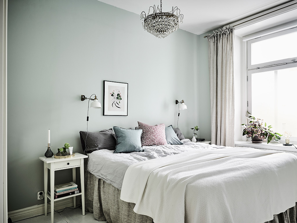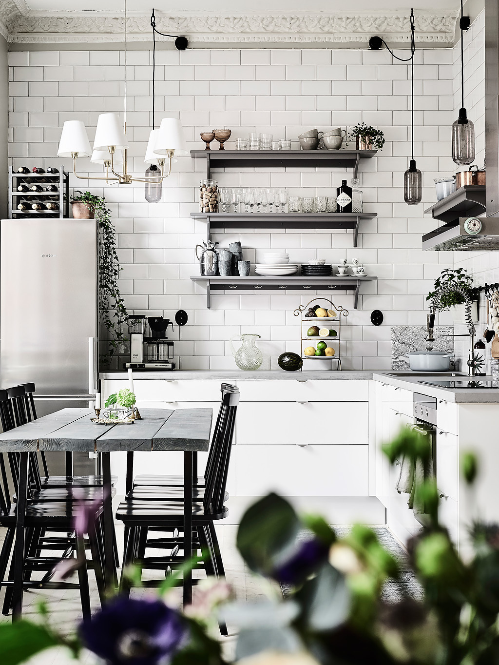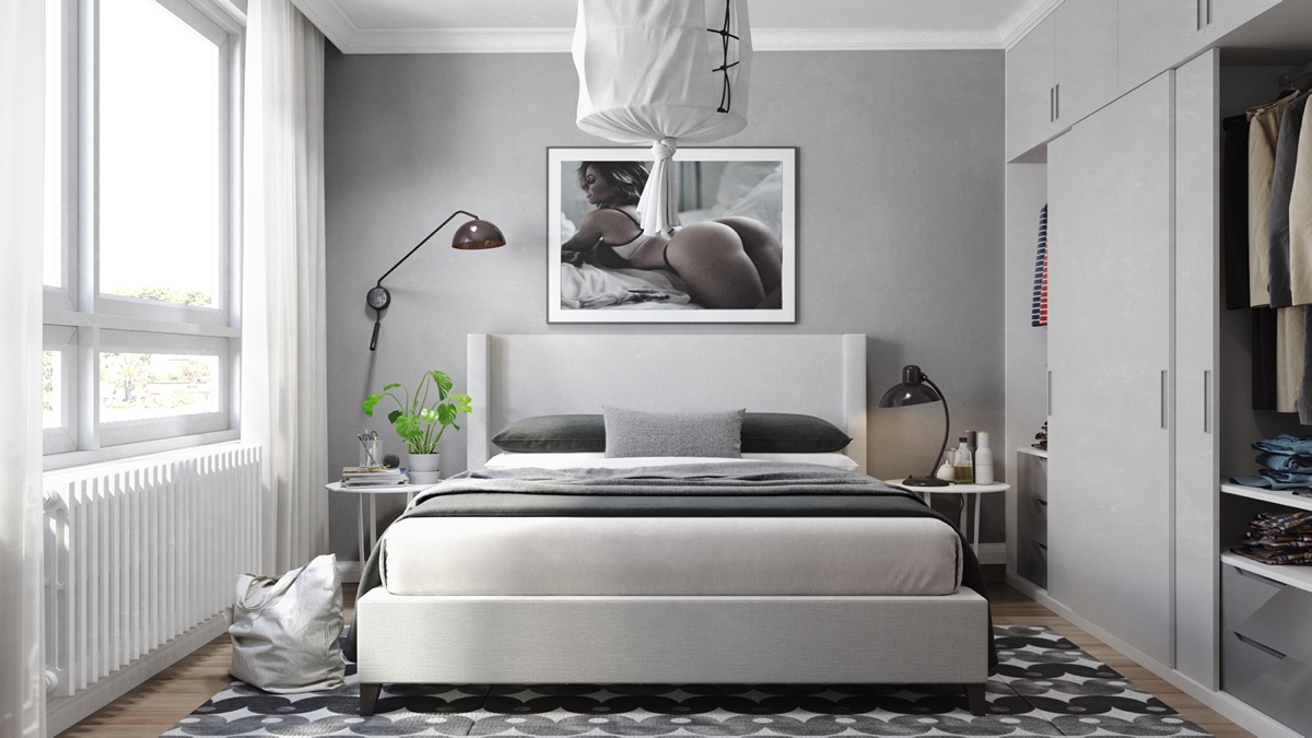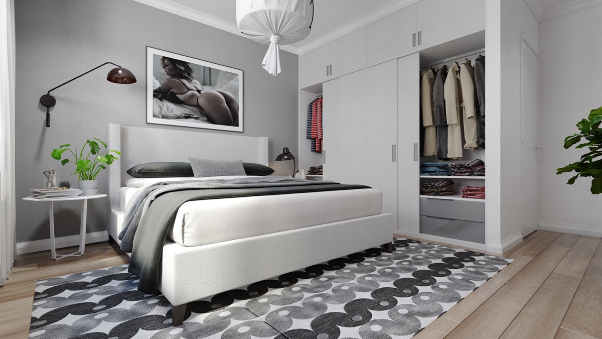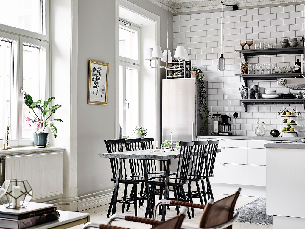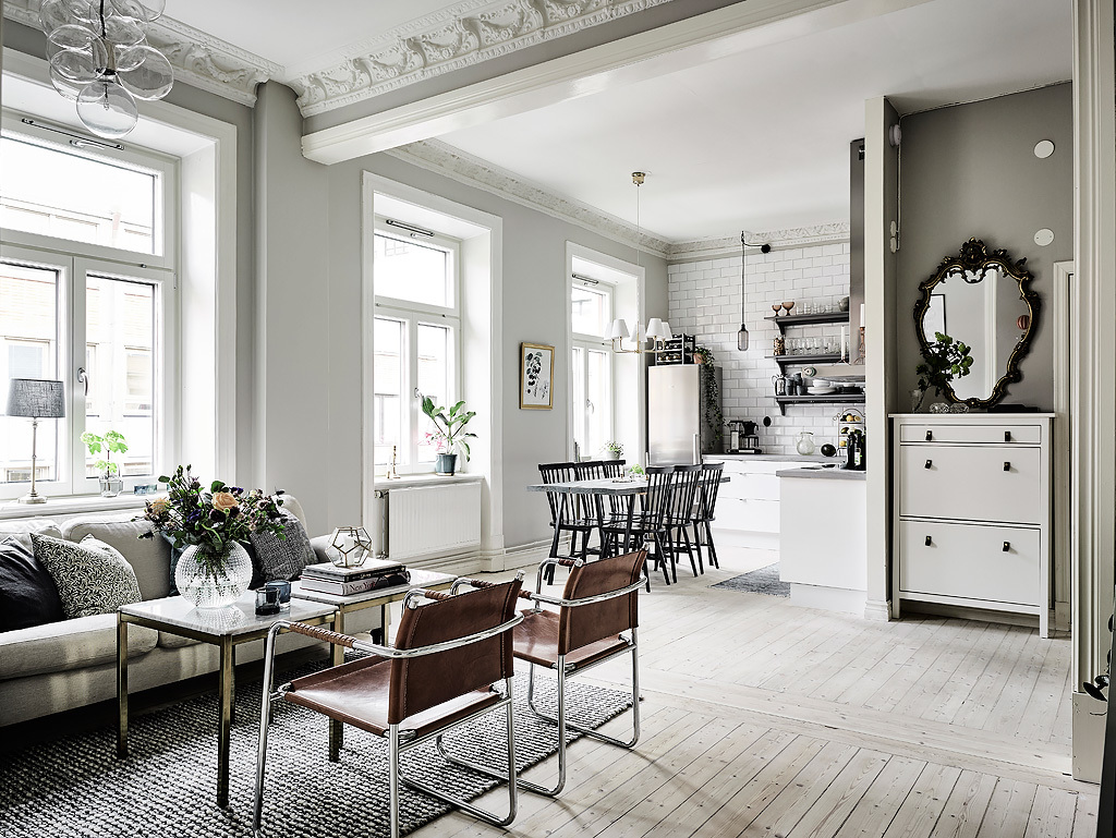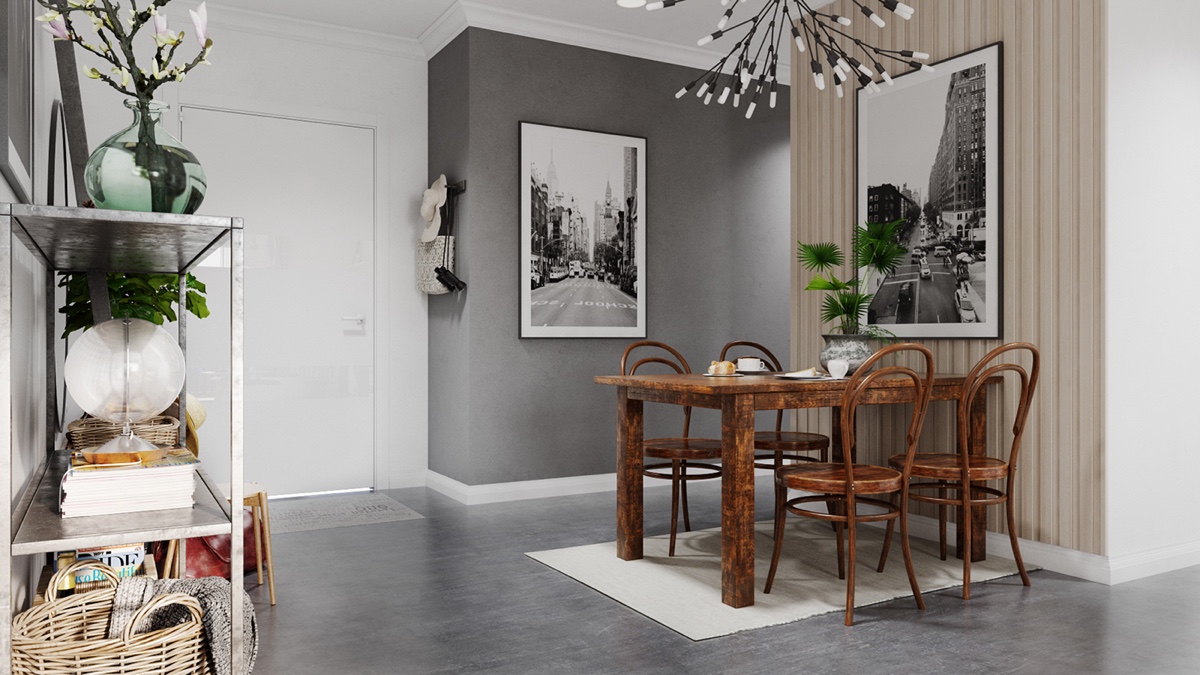 Ето това пространство е апартамент, декориран в сиво, бяло и зелено. Зелен цвят обитава пространството, представен от саксийни растения и картина. Елегантна бетонна настилка се докосва до килим, който прави сивото и бяло почти монохромни. На лице имаме разкошен диван, романтичен полилей в бяло и шифонени завеси. Два кожени табуретки правят контраста по-остър. Трапезарията предлага еклектичен набор от мебели, осеяни с растения. Клонки от черни и бели LED лампички създава монохромен полилей. Сиви и бели портрети създават по-съвременно излъчване.