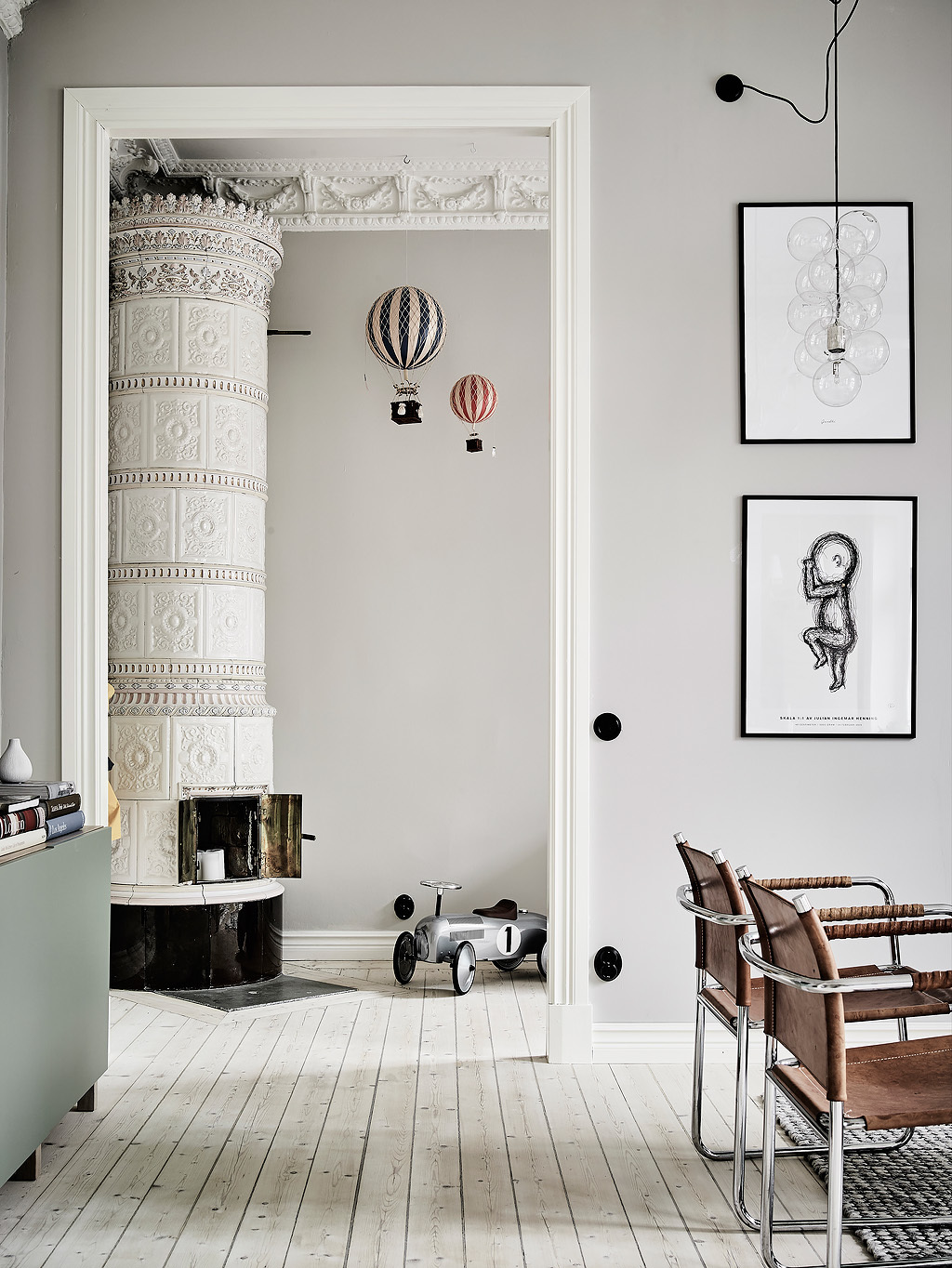 Последното пространство е с по-леки тонове на сивото. Виждаме омпилация от мечтателни илюстрации, всяка различна със своята артистичност. Вълнена сива черга е на преден план. Пространството се отваря, за да покаже камината и кухня в сива гама.