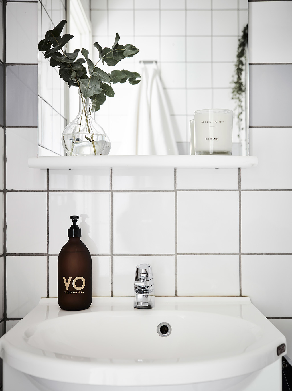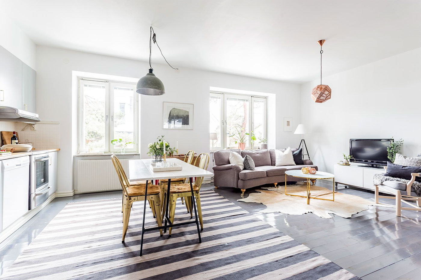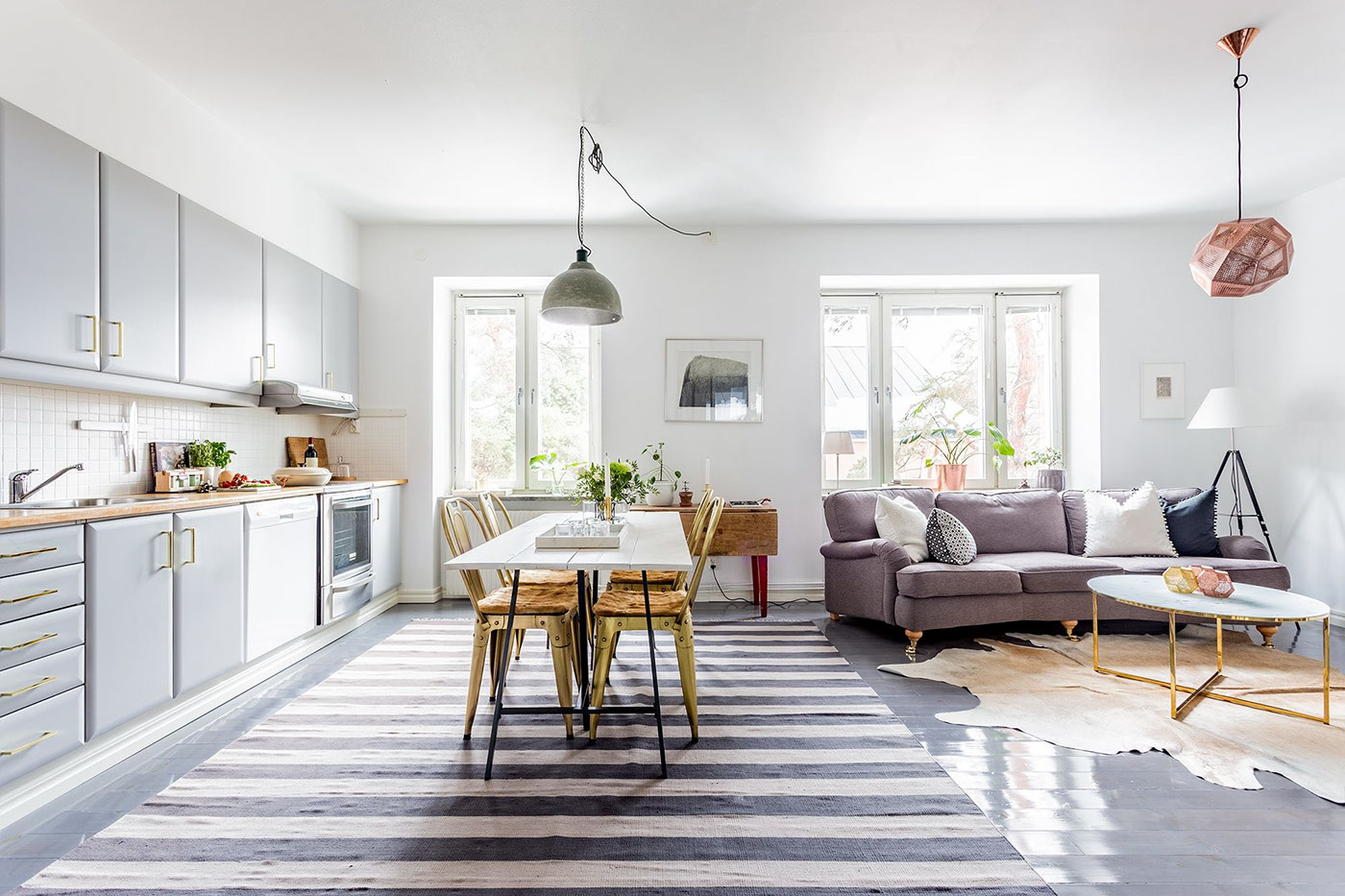 Второто скандинавско пространство прави изявление със сивото дюшеме. Заобиколена от бели стени и сиви кухненски шкафове, основната жилищна площ се колебае между сиво и бяло – в раиран килим, сив диван и възглавници. Цветни функции изскачат редувайки се.