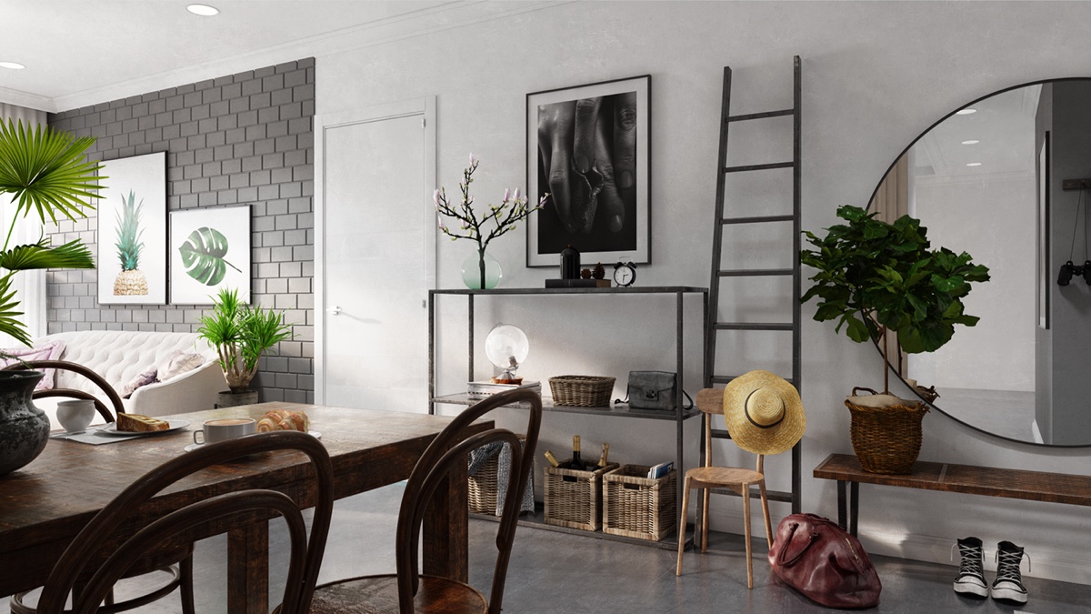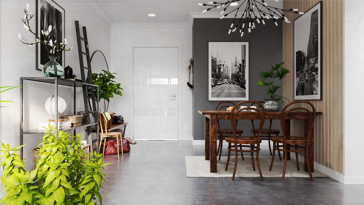 Ето това пространство е апартамент, декориран в сиво, бяло и зелено. Зелен цвят обитава пространството, представен от саксийни растения и картина. Елегантна бетонна настилка се докосва до килим, който прави сивото и бяло почти монохромни. На лице имаме разкошен диван, романтичен полилей в бяло и шифонени завеси. Два кожени табуретки правят контраста по-остър. Трапезарията предлага еклектичен набор от мебели, осеяни с растения. Клонки от черни и бели LED лампички създава монохромен полилей. Сиви и бели портрети създават по-съвременно излъчване.