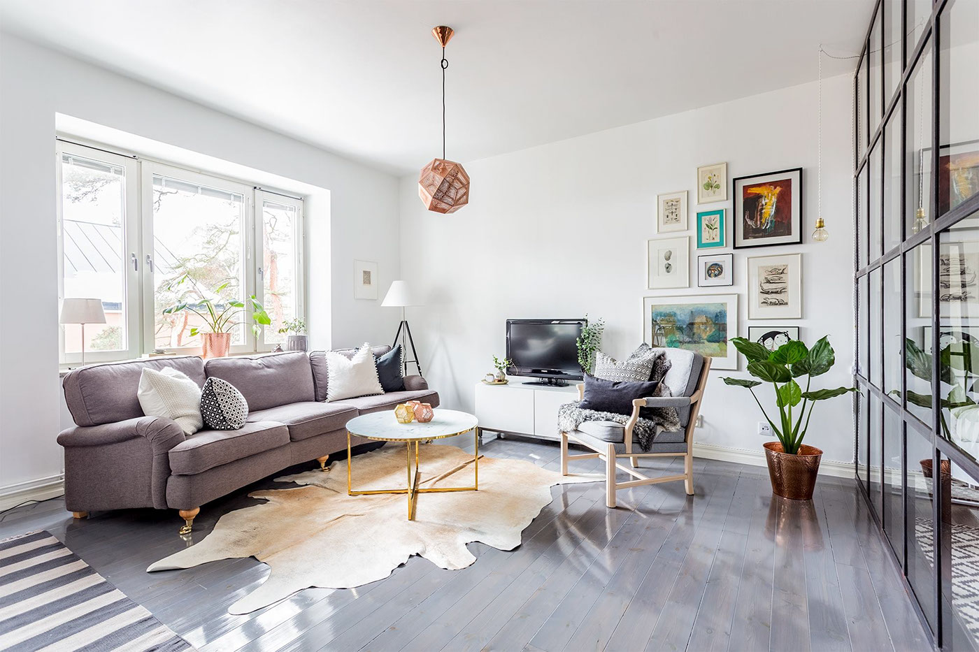 Второто скандинавско пространство прави изявление със сивото дюшеме. Заобиколена от бели стени и сиви кухненски шкафове, основната жилищна площ се колебае между сиво и бяло – в раиран килим, сив диван и възглавници. Цветни функции изскачат редувайки се.
