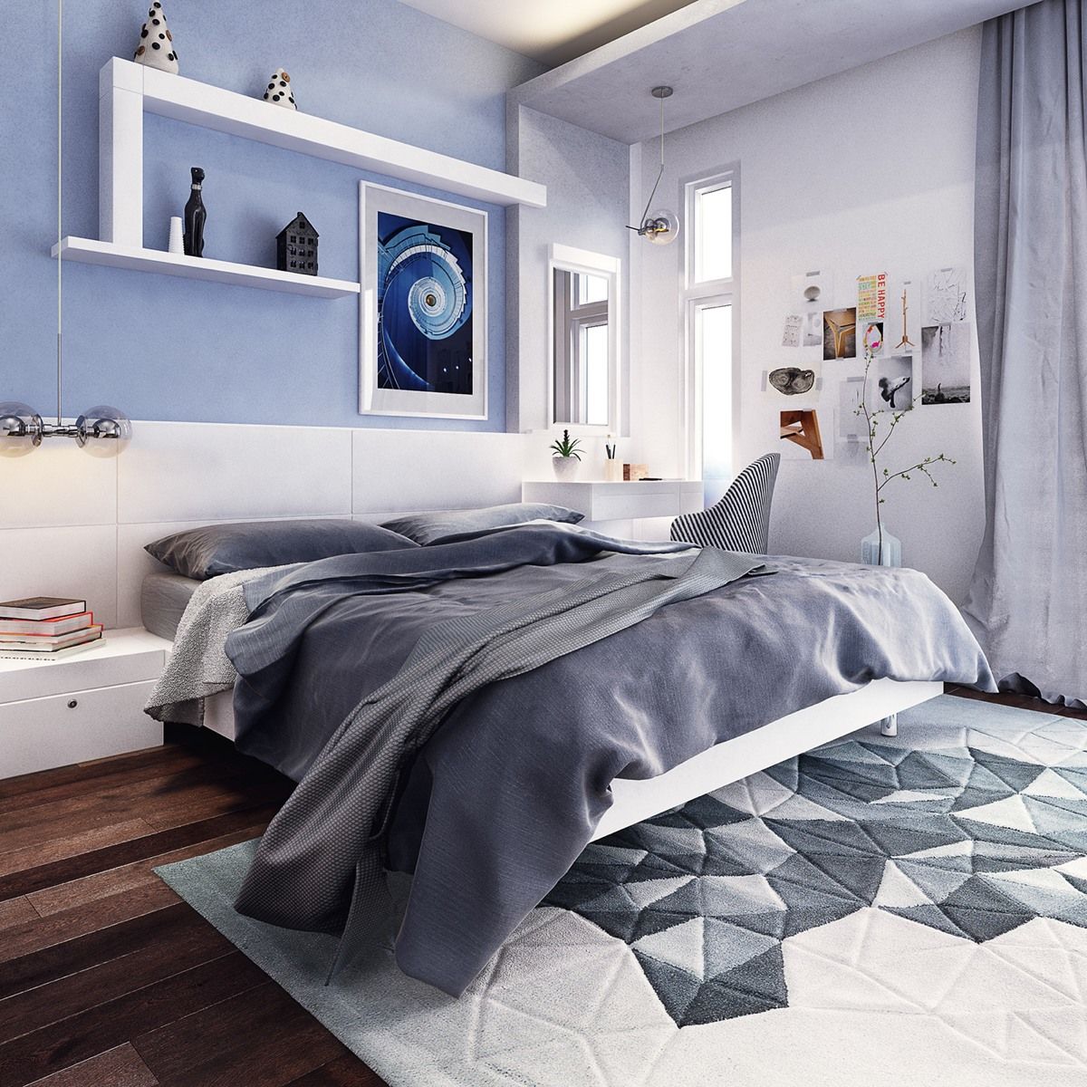 Синя и спокойна палитра осигурява релаксираща атмосфера. Важно е да имате това чувство на баланс в спалнята – успокояващите теми помагат да отведете далеч притесненията от деня. Въпреки, че прозорците са относително малки, те използват височината в своя полза, за да уловят пълния ефект на хоризонта. отпечатъкът с вита стълба – този дизайн на спалня е за ентусиасти.