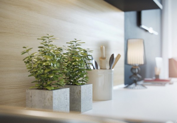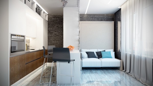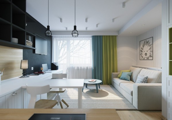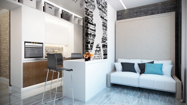 Този дом е предназначен за млада жена. Акцентът безспорно са меките, неутрални светли тонове и изразеното скандинавско влияние. В рамките на 30 кв.м имаме едно невероятно усещане за простор, като разделението между всяко пространство е наистина вдъхновяващо. Играта с геометричните форми и лъскави и огледални повърхности, дори и при лампите, е една реплика към разкоша, уюта и лукса дори и върху ограничени пространства.