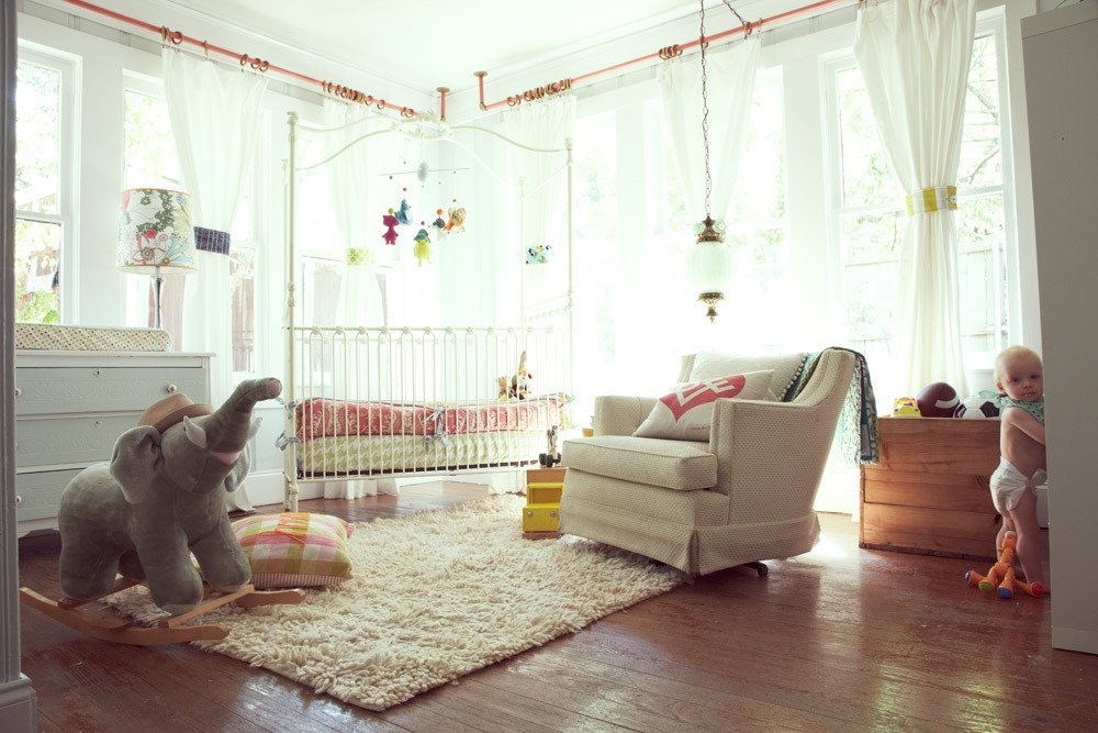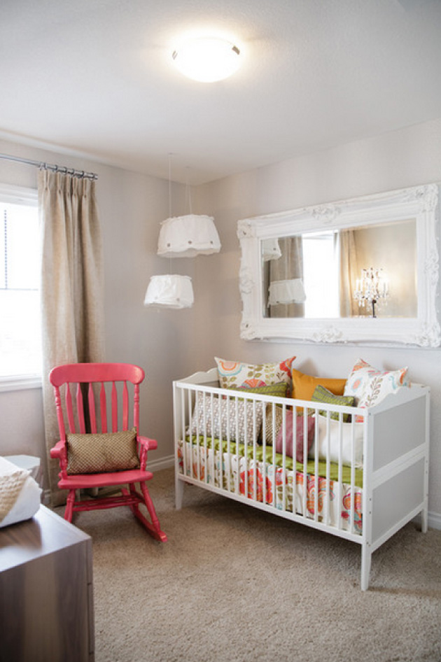 Светъл интериор с ярки аксесоари, мебели от различни сетове, различни шарки, голямо огледало на стената с рамка с орнаменти .. съберете всичко това и ще се получи много оригинален дизайн. На пръв поглед това е невъзможна и безвкусна комбинация, но истината е, че такава бебешка стая изглежда много сладка.