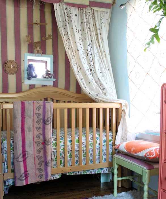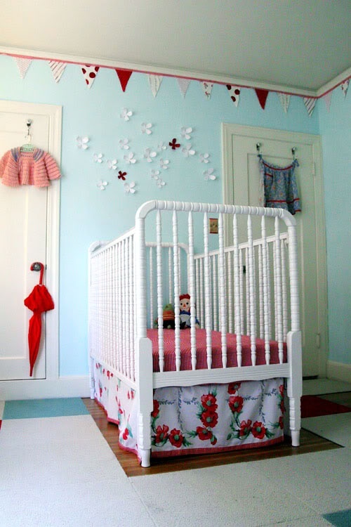 Защо не отидете по-далеко и освежите Винтидж темата с ярки цветове. Виждали сме шарките със цветя да се използват в ретро кухненските дизайни, но те пасват перфектно на бебешката стая и й придават много романтичен вид.
