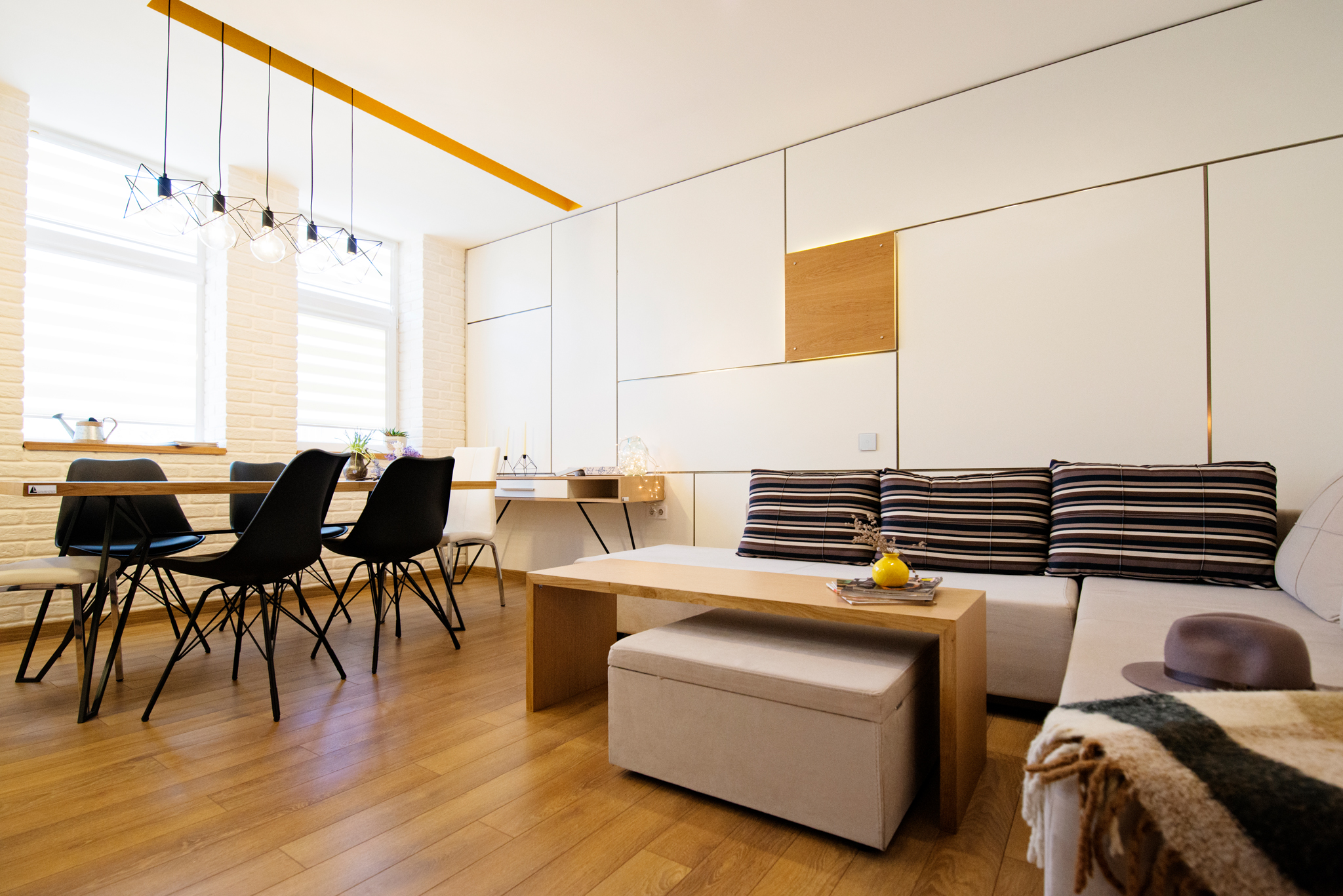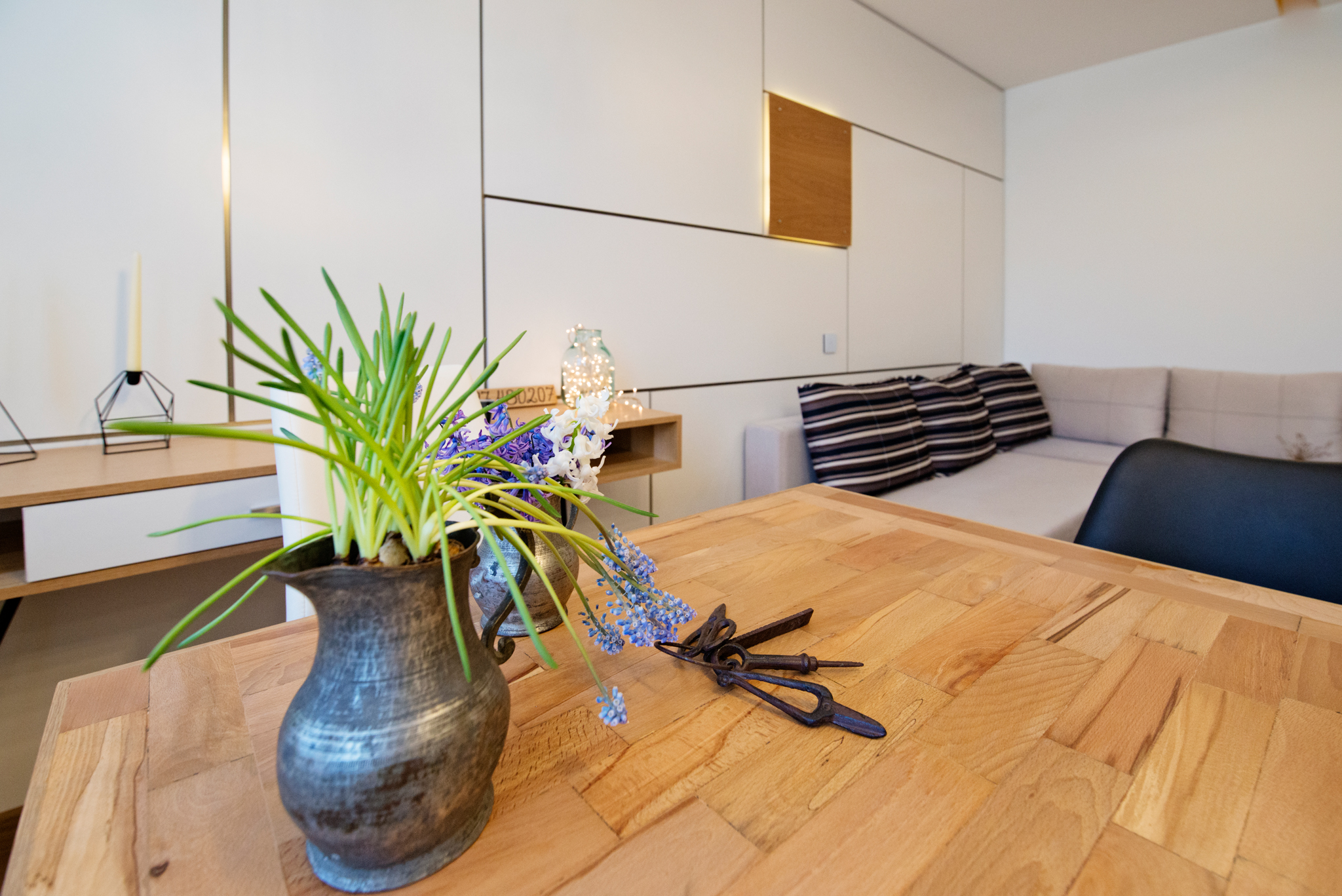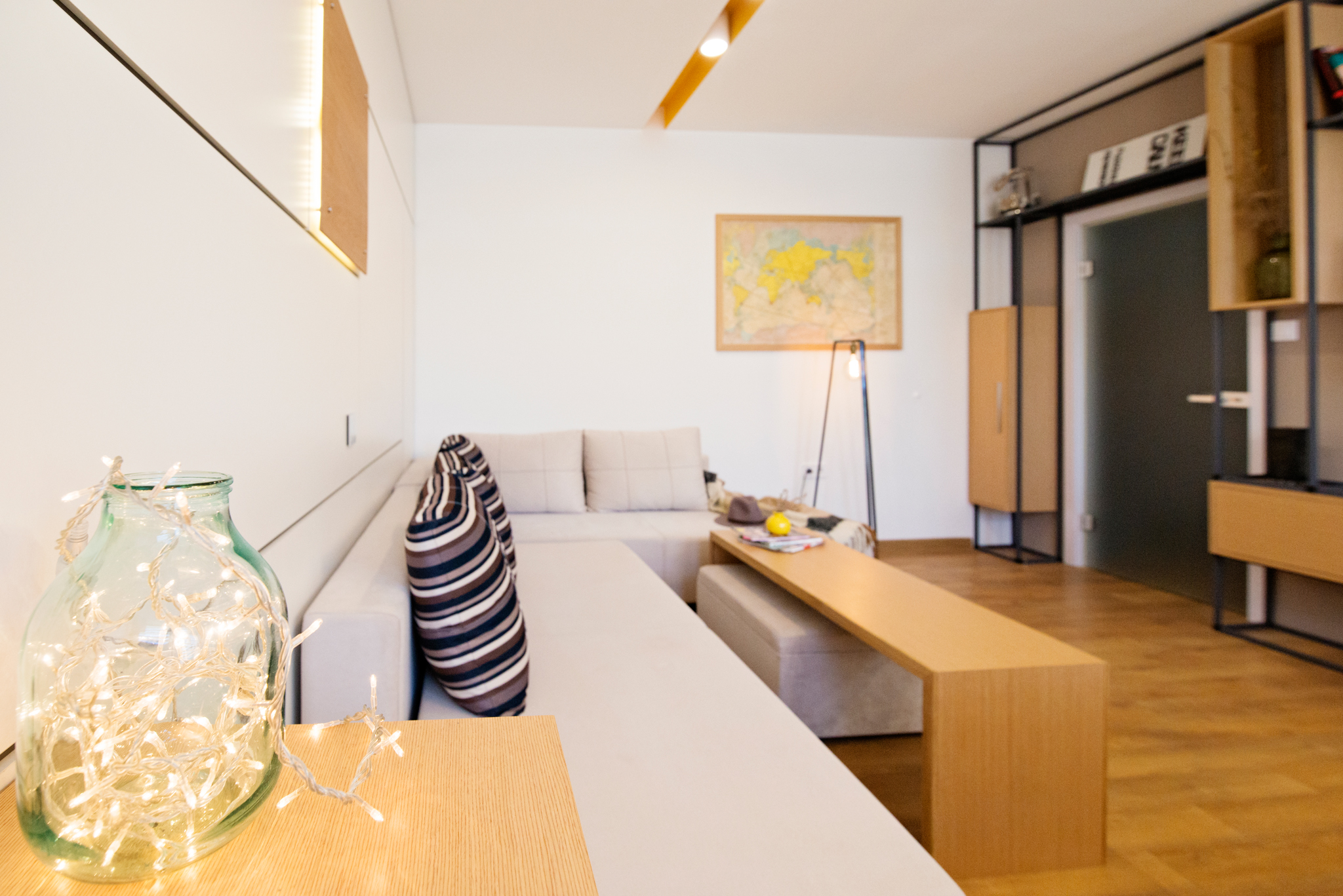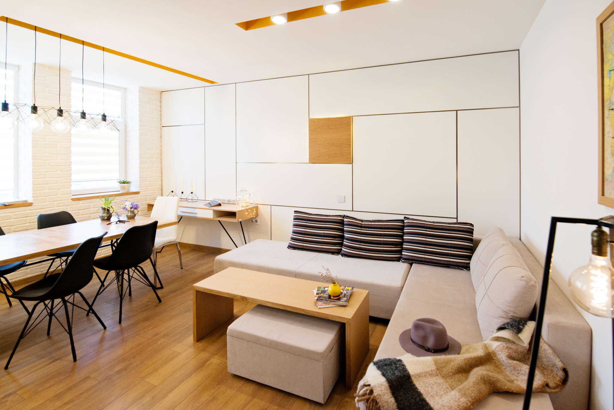 WOOD&WHITE представлява интериорно решение на двустайно жилище, собственост на млада двойка. Този артистичен апартамент се намира в стара тухлена сграда, разположена в красивата морска градина на Бургас, на няколко крачки от плажните алеи.