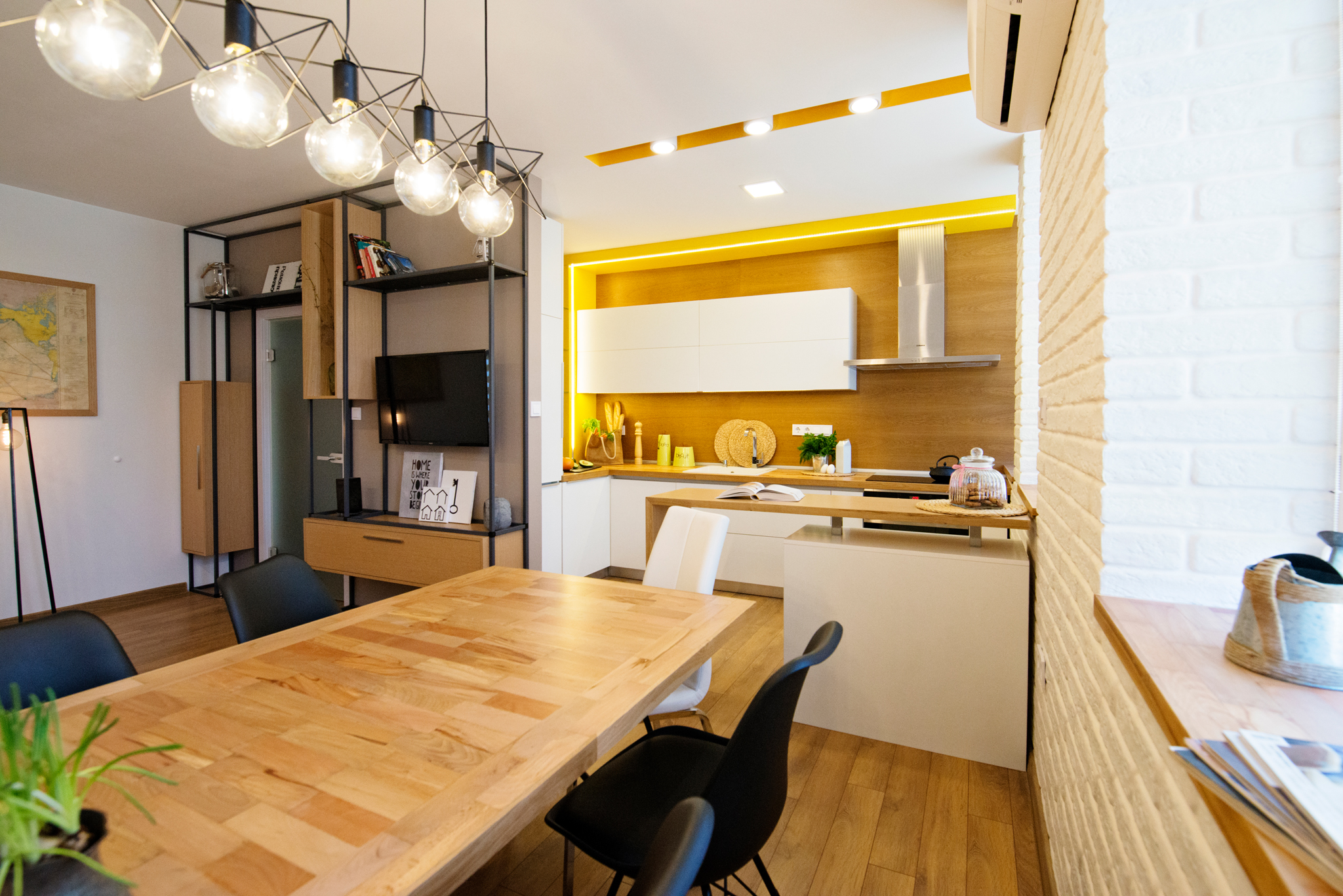 Интериорното решение представлява съчетание от модернистични авторски елементи, организирани в пространство, с изявени препратки към индустриалния и винтидж стил. Основният мотив в изграждането на проектната концепция е използването на топлотата и характерността на ръчно обработената, естествена дървесина, в комбинацията й с чистотата на белите форми и футуристичността на авторски метални елементи. Ествествените материали са умело комбинирани с акценти, подчертани със светли и топли цветове. Преминаващата през цялото жилище бяла тухлена стена обединява пространствата, като носи усещане за завършеност и уют.