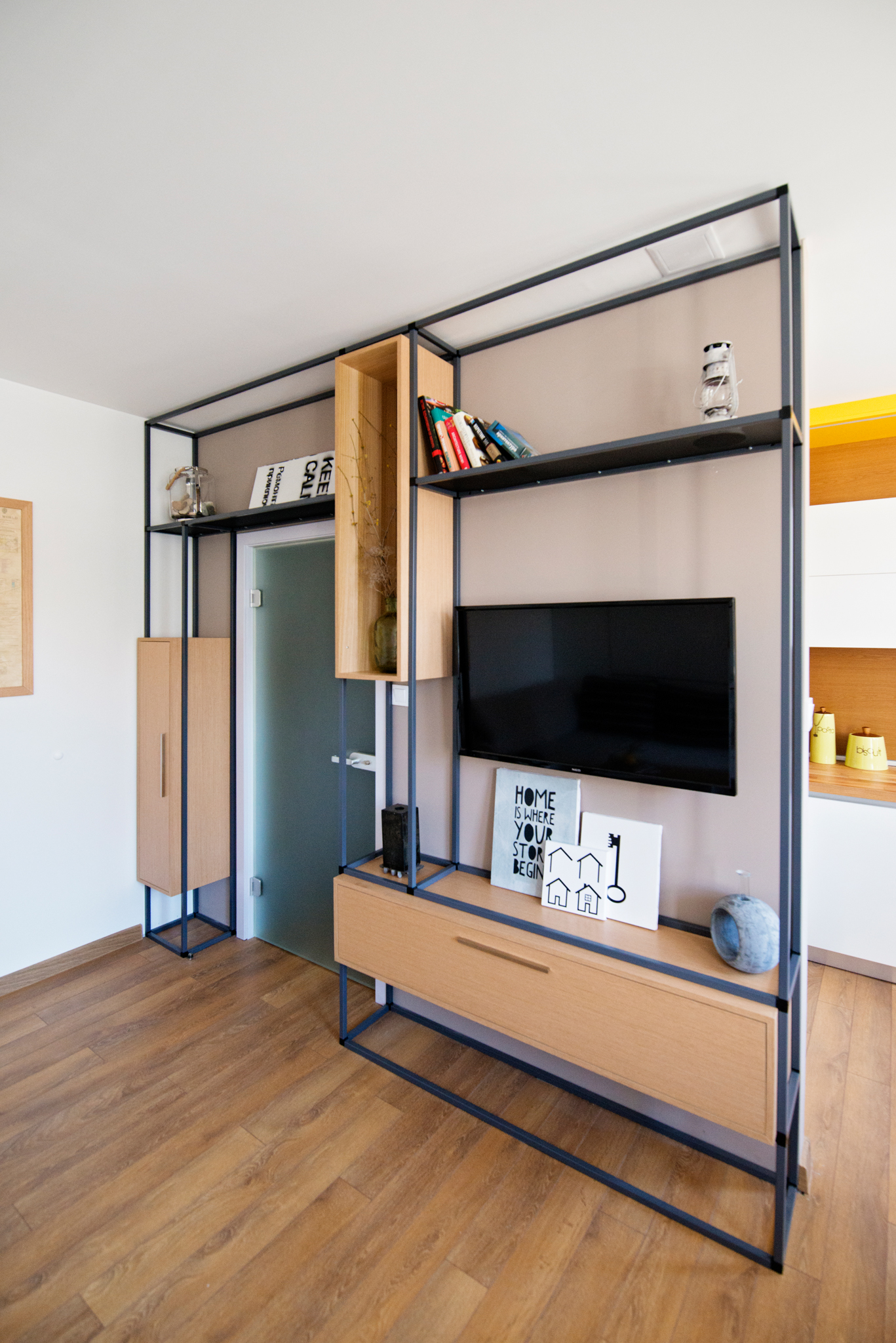 Същестуващото разпределение предлага ниска степен на функционалност и комфорт, което налага нуждата от цялостно преустройство и преорганизиране на неголямото пространство, от близо петдесет квадратни метра. Изцяло новото решение организиращо двустайният аристистичен апартамент, съчетаващ в себе си висок комфорт и максимална функционалност.