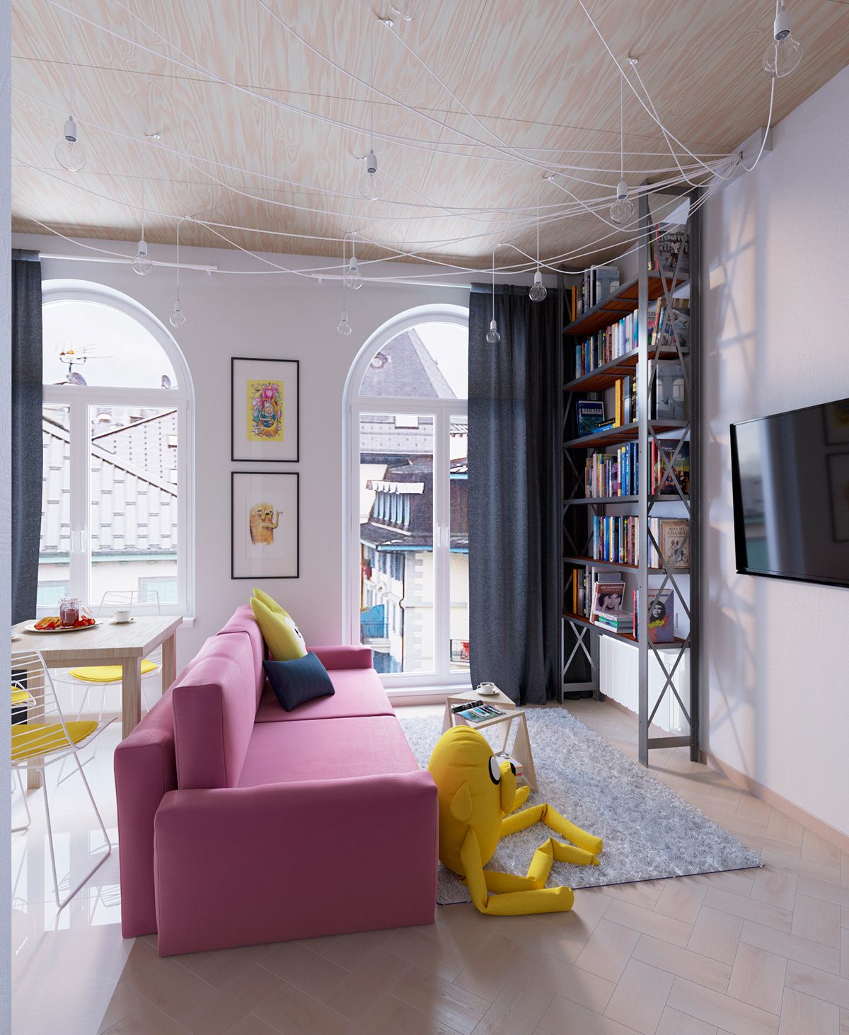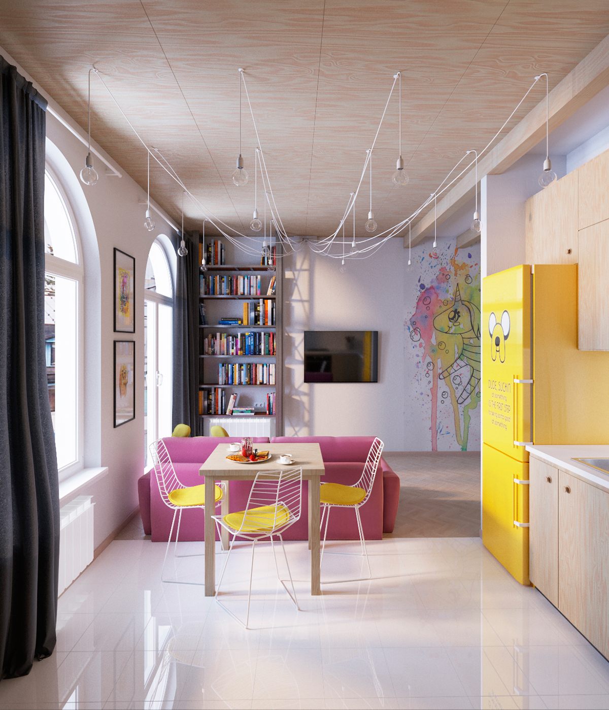Това е апартамент за феновете на приключенските времена. Неговата ярка цветова схема в розово и жълто тонизира стаята – атмосфера която гостите могат да се оценят, дори ако те никога не са гледали анимационен филм. Декорът на отворени пространства в дома с такава смела тема изискват сдържаност – докато останалата част от дома се радва на разнообразие от закачлив декор, на стената остава без декор като свеж фон. Лимонено жълто прояснява трапезарията, и дори хладилника попада в темата.
