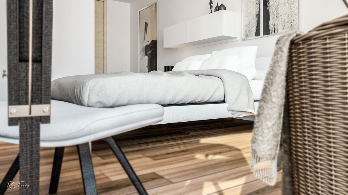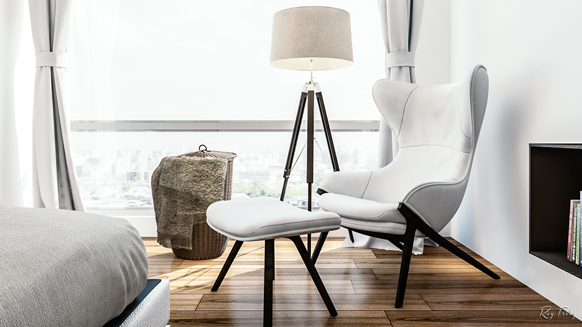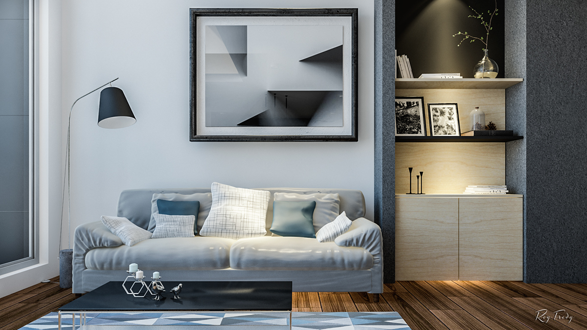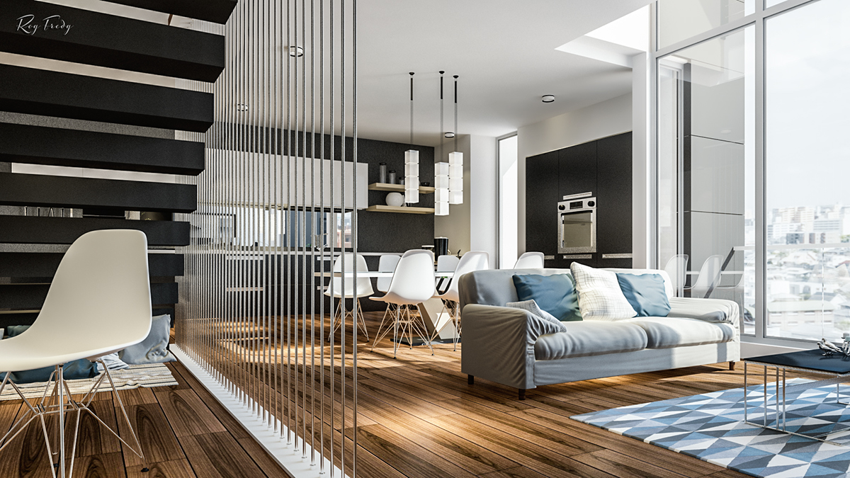 Вдъхновен от индустриалния интериорен дизайн е този апартамент. Наистина ярък стил. Черните елементи не са превземащ акцент върху ярките бели повърхности, а Обзавеждането остава просто, семпло, оформлението е практически насочено, и е трудно да се игнорират уникалните архитектурни особености. Успокояващи сини акценти правят свеж и удобен интериора. Белите мебели изглеждат още по-видни срещу тъмни дървените подове и черни стенни акценти.