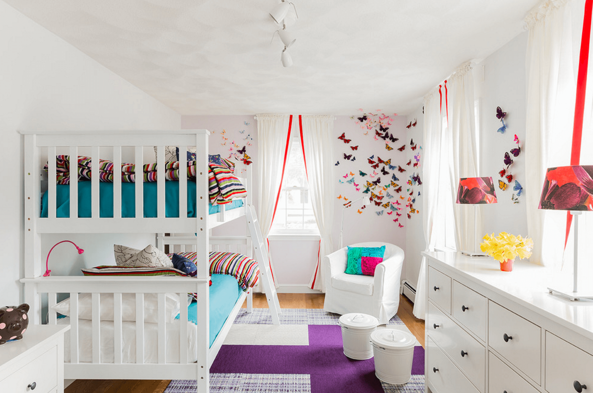 Когато става въпрос за намиране на цветни акценти, първо помислете какво вече има вашето дете. Стикери за стена, легла и килими всички могат да добавят цвят за детска стая, но можете лесно да ги промените за вбъдеще, когато децата порастнат.