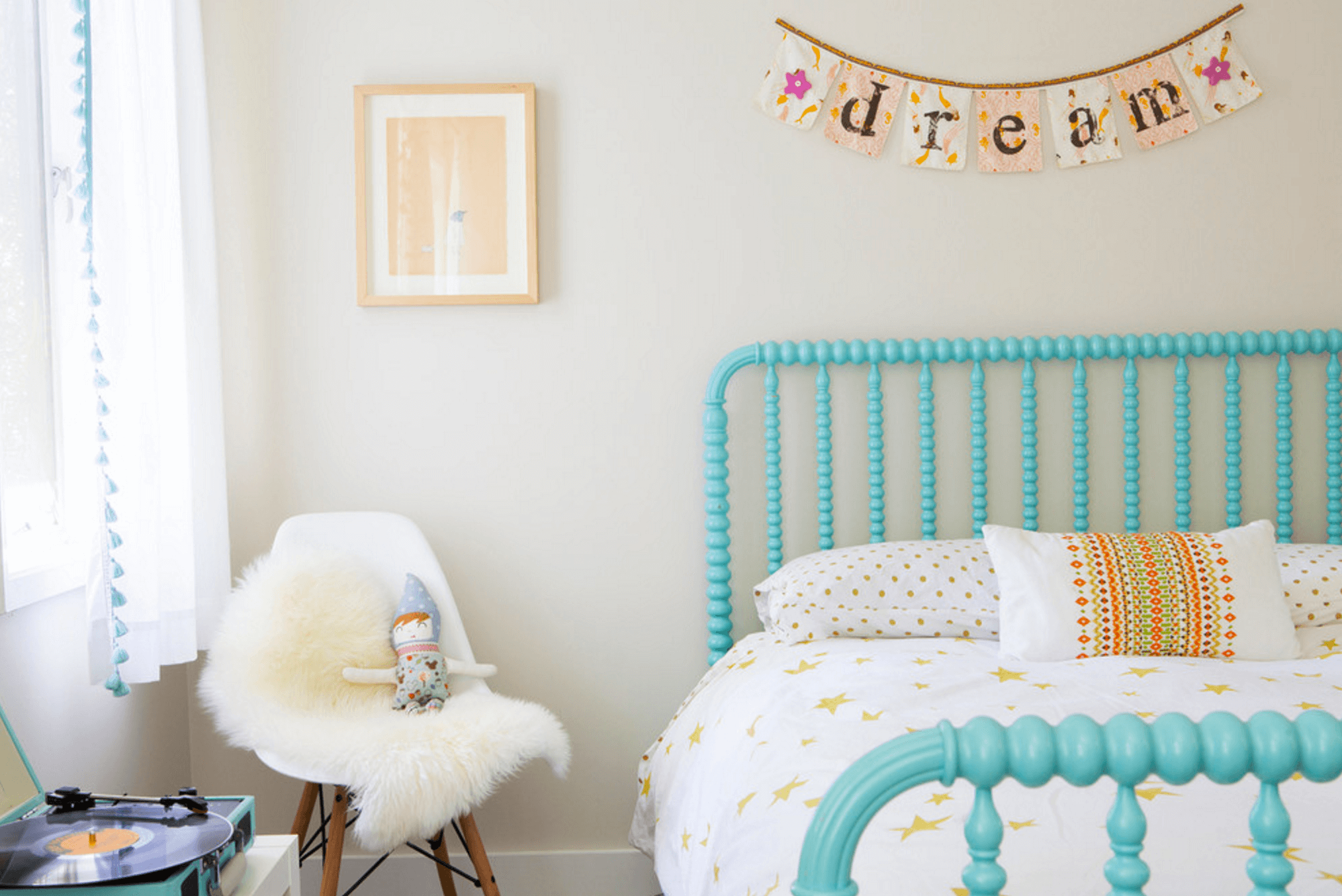 Рамката на леглото, завесите, грамофона – подробностите в тази модерен бохемска спалня са смели, без да са поразителни.