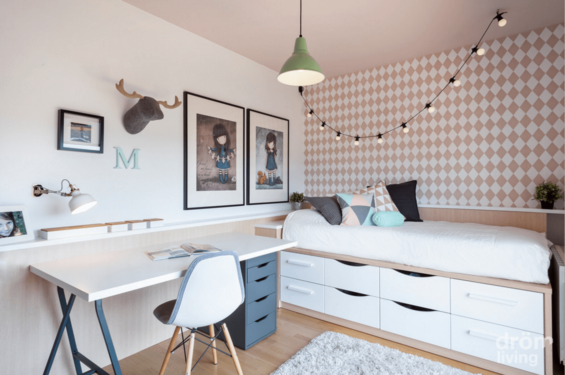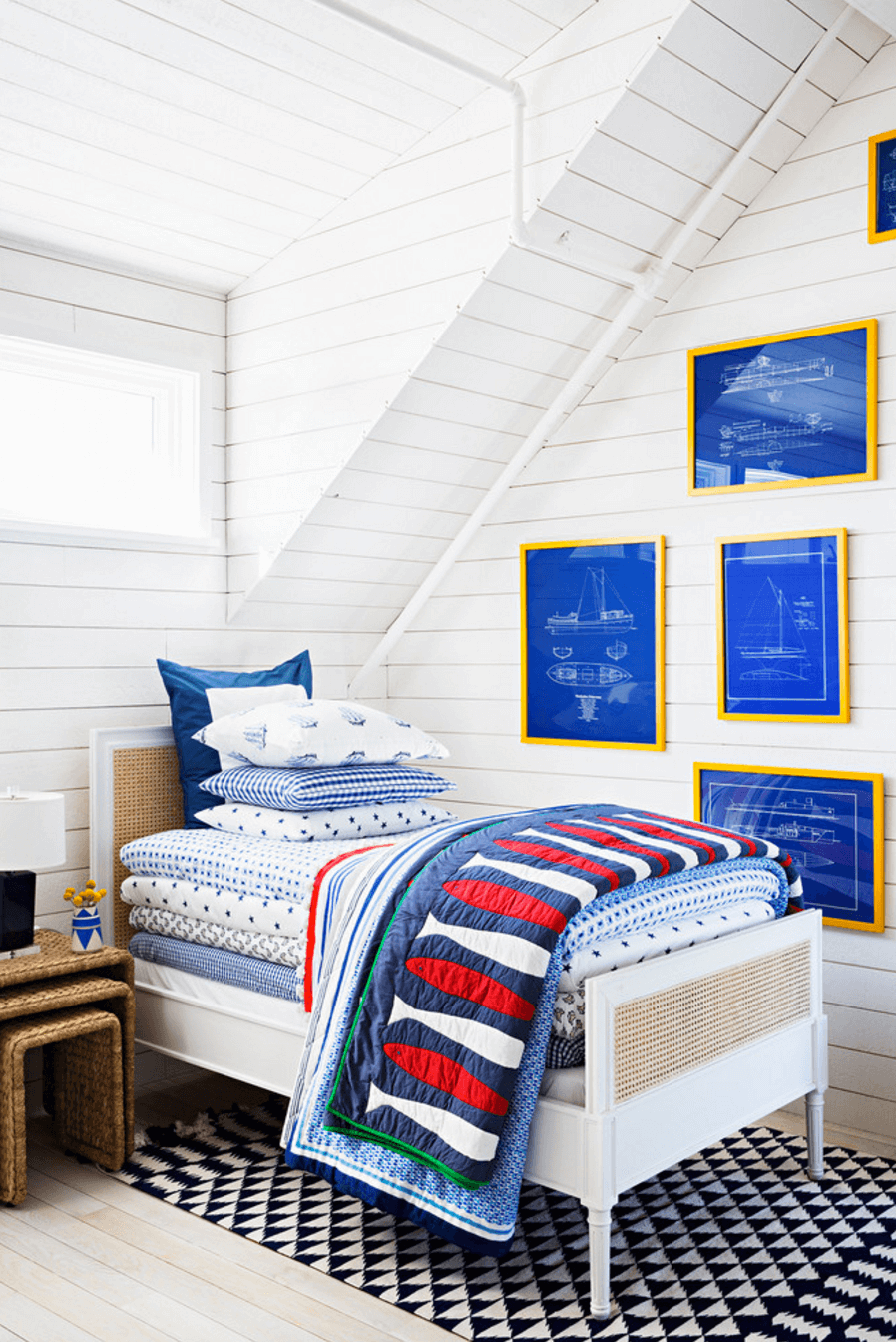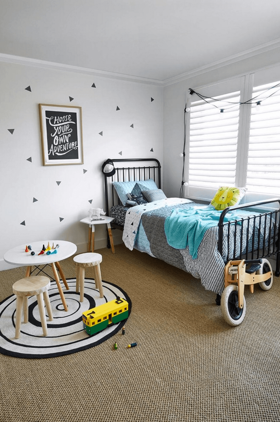 Няколко триъгълници вършат чудесна работа за тези бели стени. С акценти в бяло, черно и дърво – тази стая е свежа и младежка.